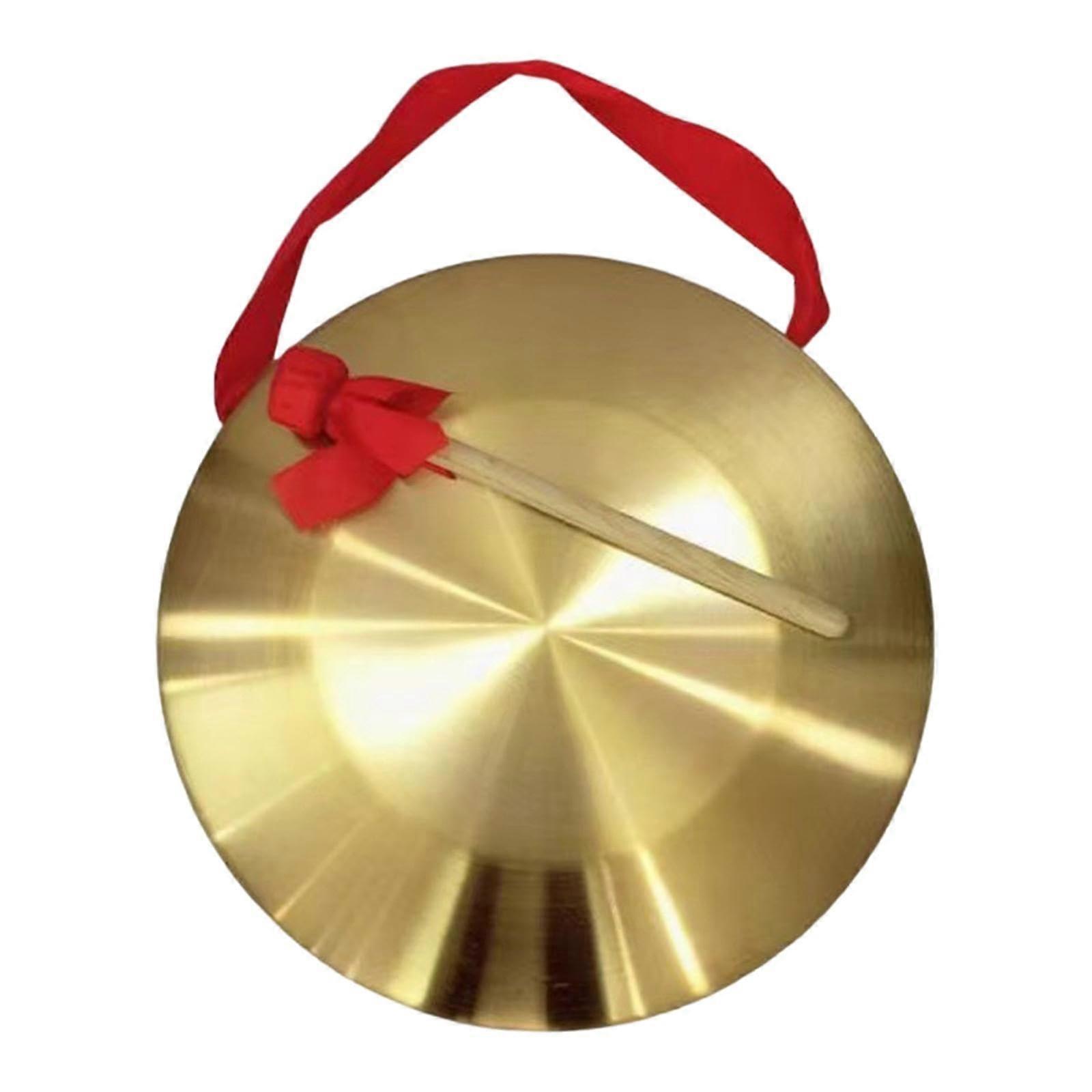 22 cm Brass Hand Gong with Mallet and Red Ribbon Key benefits Durable construction: Crafted from quality brass with mechanical stamping, electroplating, hand polishing, and antiquing for an even finish and long service life. Authentic resonant sound: Produces rich, traditional Chinese gong tones that project clearly for performances, ceremonies, and signals. Ready to use: Complete package includes one 22 cm brass gong, one wooden mallet, and a red ribbon so you can start playing immediately. Portable and easy to handle: Handheld design and lightweight construction make it simple to carry and use anywhere. Features Material: Brass body for consistent tone and durability; wooden mallet included. Size: 22 cm diameter, suitable for handheld use and small to medium spaces. Craftsmanship: Traditional finishing processes yield a powerful, resonant sound with lasting appearance. Package contents: 1 gong instrument, 1 mallet, red ribbon. Why customers need this Reliable signal and sound source for events that require clear acoustic cues. Versatile instrument that serves as a musical prop, ceremonial tool, or unique toy for children. Attractive and meaningful gift for birthdays, holidays, housewarmings, business or office openings, and graduations. Practical use scenarios Cultural festival or stage performance: Use the gong to mark transitions, accent performances, or add authentic traditional sound to a show. Ceremony or ritual: Employ the gong during processions, path clearing ceremonies, or ritual moments that require a clear, resonant tone. Event signal or alert: Use as an audible signal for gatherings, small community alerts, or ceremonial announcements. Additional details Handheld format is ideal for portability and convenient use. Slight variations in color or size may occur due to manual measurement and monitor differences. Please allow small measurement deviations.