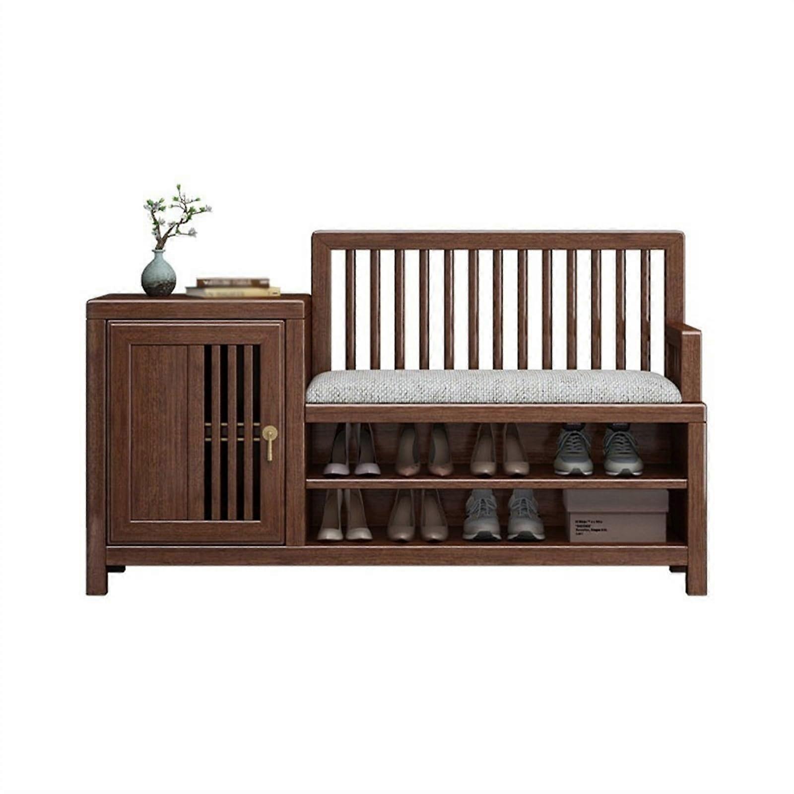 Chinese Style Wooden Shoe Storage Bench with Padded Cushion and Cabinet Keep shoes organized, create a tidy entry, and add a practical seating spot with this Chinese style shoe bench. Its wood construction and builtin storage cabinet make it a versatile solution for closets, hallways, and entryways where both seating and concealed storage are needed. Key benefits Organizes shoes and reduces clutter: Shelved cabinet stores multiple pairs and keeps footwear out of sight, helping maintain a clean, orderly space. Comfortable seating for daily use: Padded cushion provides a comfortable place to sit while putting on or taking off shoes. Space saving and multifunctional: Combines a shoe shelf cabinet and bench in one piece, making it ideal for compact areas where separate furniture would not fit. Timeless design: Chinese style aesthetic adds a subtle decorative touch that works with a range of interiors. Features and attributes Function: Bench provides seating and a storage cabinet offers multiple shelves for shoes, slippers, and small accessories. Materials: Wood frame with a cushioned seat for comfort. Compatibility and placement: Designed for closets, hallways, entryways, and mudrooms; fits narrow or small spaces while offering practical storage. Performance: Stable, everyday use solution that makes daily routines neater and more efficient. Finish and look: Traditional Chinese style lines that blend with contemporary and classic decor. Practical uses Entryway: Sit to put on shoes, store frequently used footwear and hide scarves, umbrellas, or shoe care items inside the cabinet. Closet: Add seating for dressing while using the cabinet shelves to organize seasonal shoes and up floor space. Hallway or mudroom: Keep traffic areas tidy by storing outdoor shoes and slippers behind closed doors while maintaining a comfortable spot to sit. What customers will appreciate Combines storage and seating to solve cramped or cluttered entry points. Concealed cabinet keeps the room looking tidy without sacrificing accessibility. Versatile placement makes it suitable for apartments, homes, and shared living spaces. Specifications summary Style: Chinese style Primary components: Wooden bench with storage cabinet and padded cushion Recommended locations: Closet, hallway, entryway, mudroom This shoe storage bench offers a practical, attractive way to manage footwear and daily clutter while providing a comfortable seat where it is most useful.