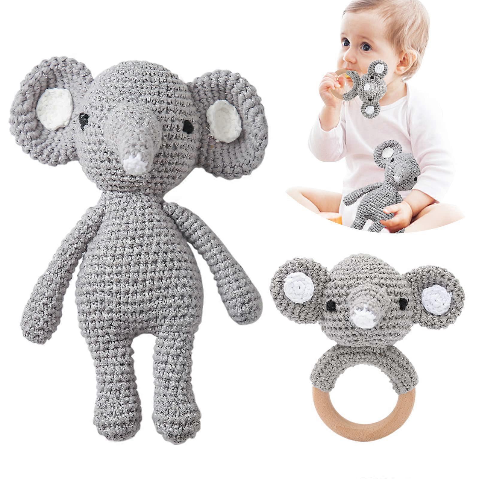 Crochet Baby Rattle Elephant with Natural Wooden Teether Handmade Sensory Toy for Newborn Gift