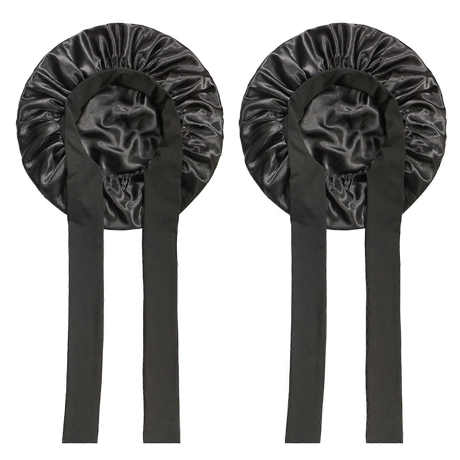 2Pcs Satin Sleep Bonnet Silk Hair Bonnet for Women Curly Hair Frizz Reduction Adjustable Tie Band Black