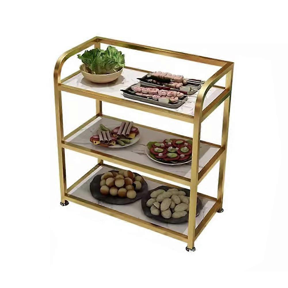 3Tier Heavy Duty Utility Cart Color GoldC, Size 60x30x65cm Why this cart matters Keeps work areas organized and reduces trips back and forth. Three open tiers provide clear visibility and easy access to tools, supplies, plates, or products. Compact footprint fits narrow spaces while offering vertical storage to maximize a small area. Designed for heavy duty use in commercial and home environments so it handles frequent handling and daily tasks. Key benefits Versatile use: functions as a kitchen utility cart, beauty salon trolley, industrial serving cart, and mobile service cart for restaurants and bars. Space efficient: 60x30cm shelf area with 65cm overall height fits between counters, beside workstations, or next to treatment chairs. Quick access and staging: three separate shelves let you organize items by task or priority and move them together when needed. Durable design: built for demanding environments and frequent use without sacrificing ease of movement or stability. Clean, professional finish: GoldC color adds a refined look suitable for frontofhouse service and salon settings. What you get Threetier layout for sorting, staging, and serving. Compact dimensions 60x30x65cm to work in tight spaces while providing ample carrying capacity across shelves. Practical styling for visible, easytoreach storage in busy work areas. Practical use scenarios Kitchen and catering: Stage ingredients, small appliances, plated orders, or condiments for fast prep and delivery between prep area and service line. Beauty salon and spa: Store and move styling tools, bottles, towels, and treatment supplies between stations to keep services efficient and organized. Restaurant and bar service: Use as a service cart for clearing tables, transporting glassware and bottles, or staging trays and utensils for faster turnover. Suitable environments Home kitchens, professional kitchens, catering operations Beauty salons, spas, barber stations Restaurants, bars, coffee shops, bakeries Workshops, studios, and other work areas requiring mobile, tiered storage Practical notes Size and tiered design make the cart appropriate for locations where floor space is limited but frequent transport or staged storage is required. Neutral professional appearance fits frontofhouse and backofhouse settings. This 3tier utility cart delivers organized, mobile storage in a compact, durable package. Color GoldC and size 60x30x65cm provide a balance of style and function for multiple commercial and home uses.