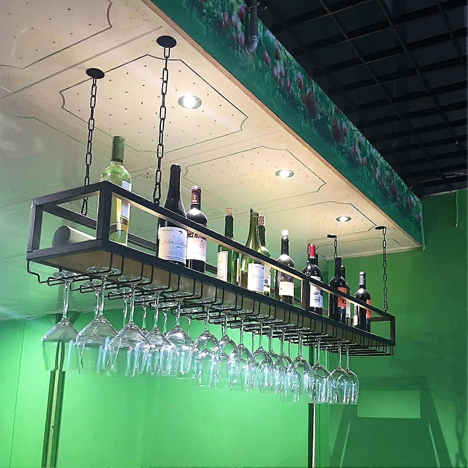 Adjustable Solid Wood and Metal Hanging Wine Glass Rack, Ceiling Mounted Shelf, 60140cm Elegant Black