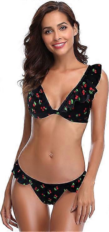 SHEKINI Bikini Two-Piece Swimsuit - Ruffle V-Neck Backless Design - Quick-Drying Cherry Pattern, Low Waist, Adjustable Straps