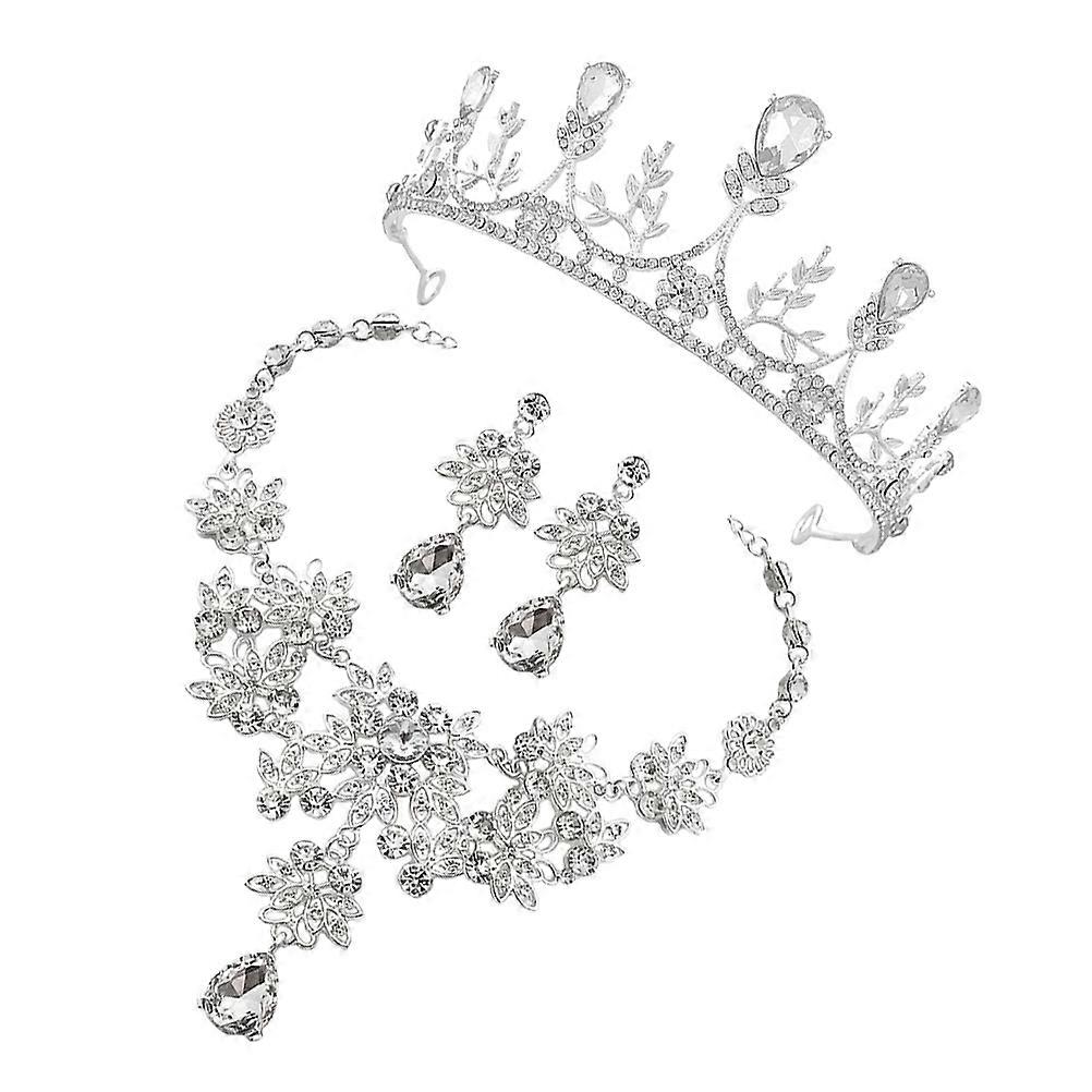 Bride Jewelry Rhinestone Crown Necklace and Earrings Set for Women 1Set Silver