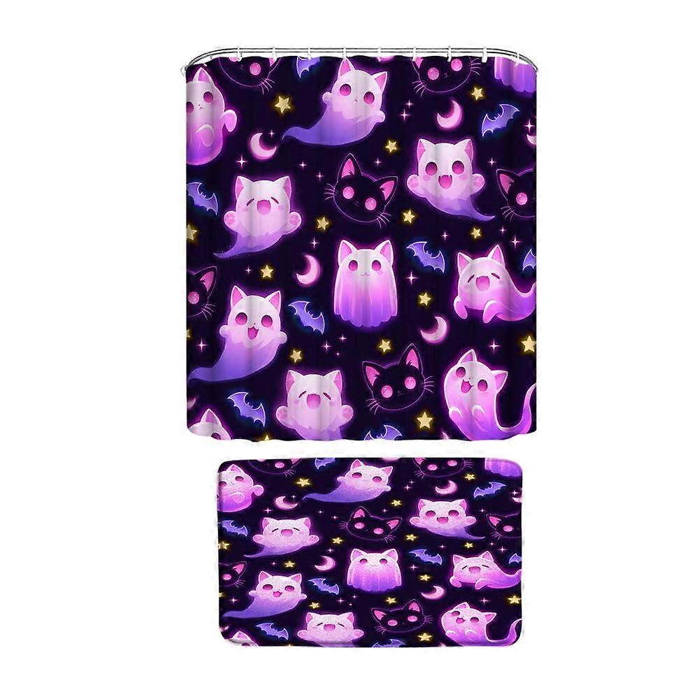 Halloween Cat Shower Curtain Set with Bath Mat, Black 70x70 Inches Bathroom Decor