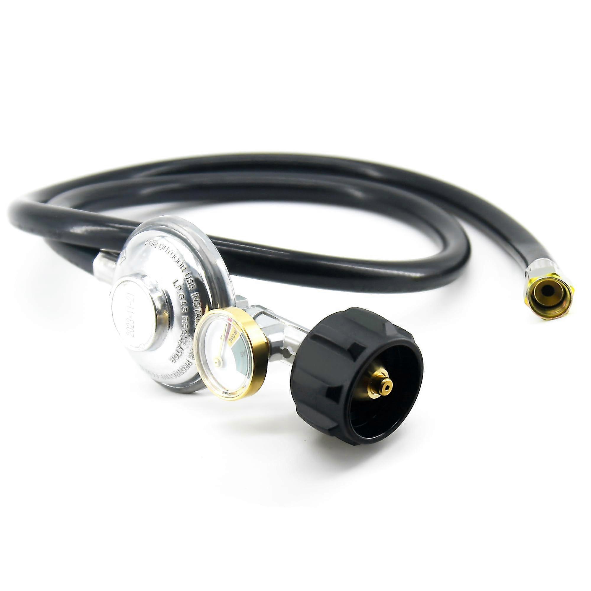 Product overview An 8 foot propane regulator hose with builtin pressure gauge and QCC1 tank connection. This hose assembly provides a secure link between common 20 lb propane cylinders and outdoor appliances using a 3/8 inch female flare nut. It is intended for use with most LP gas grills, patio heaters, and fire pit tables. Key benefits Monitor propane pressure quickly: the integrated gauge lets you check operating pressure at a glance to help diagnose low fuel or flow issues. Flexible reach: the 8 foot length creates safer, more convenient placement of the propane cylinder away from heat or foot traffic. Simple connections: QCC1 connection fits standard tank valves while the 3/8 inch female flare nut mates to most appliance inlets for a straightforward install. Ready replacement or upgrade: swap in this assembly to cracked or leaking hoses and restore reliable gas delivery. Main features Hose length: 8 feet for extended reach and flexible positioning. Tank side connection: QCC1 regulator fitting for common propane cylinders. Appliance side connection: 3/8 inch female flare nut to match standard grill and heater inlets. Builtin gauge: pressure gauge mounted near the regulator for convenient monitoring during use. Compatibility and function Designed to connect standard LP gas cylinders to a wide range of outdoor propane appliances. Functions as both a regulator to control gas flow and a hose assembly to deliver fuel while allowing pressure checks via the gauge. Practical use scenarios Backyard grill replacement: change out a worn hose on a gas grill to restore steady fuel flow and add an onassembly gauge for easy pressure checks. Patio heater setup: extend distance from a patio heater to the cylinder so the tank can be placed in a safer location without reducing performance. Fire pit table installation: connect a fire pit table to a portable tank and use the gauge to confirm correct pressure before lighting. Notes Confirm appliance inlet thread size and tank valve type before installation to ensure compatibility. Follow appliance manufacturer instructions for installation and leak testing.