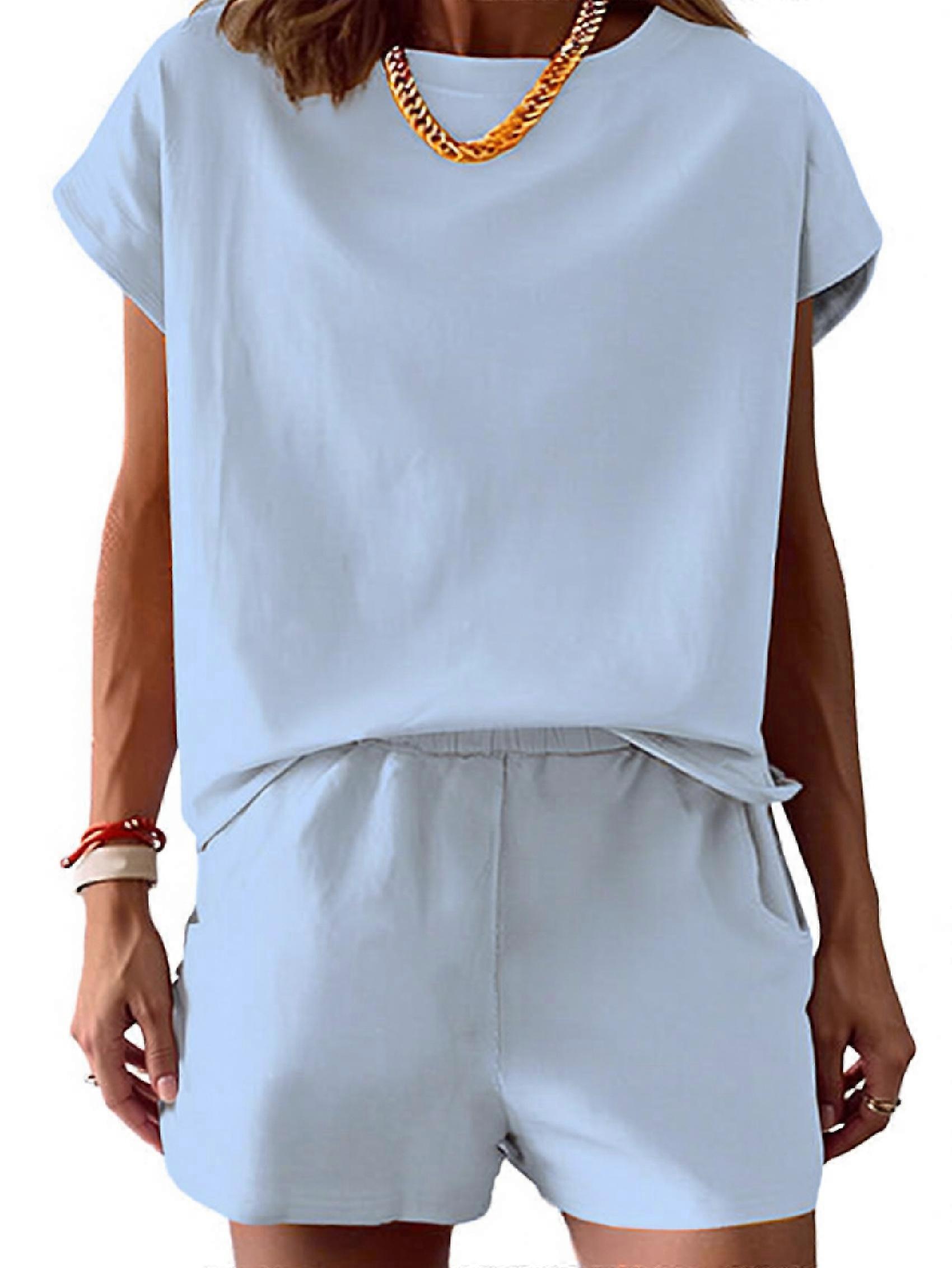 Two Piece Sets for Women Summer Crew Neck Lounge Short Sets Cap Sleeve Sweatsuit with Pocket Light Blue S