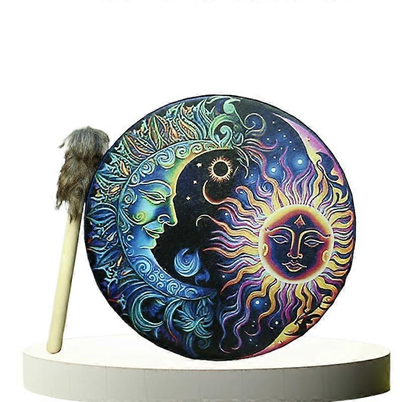 Handmade Shaman Drum 9.84 Inch Sun Moon Design Bohemian Wooden Leather Frame for Decoration and Play