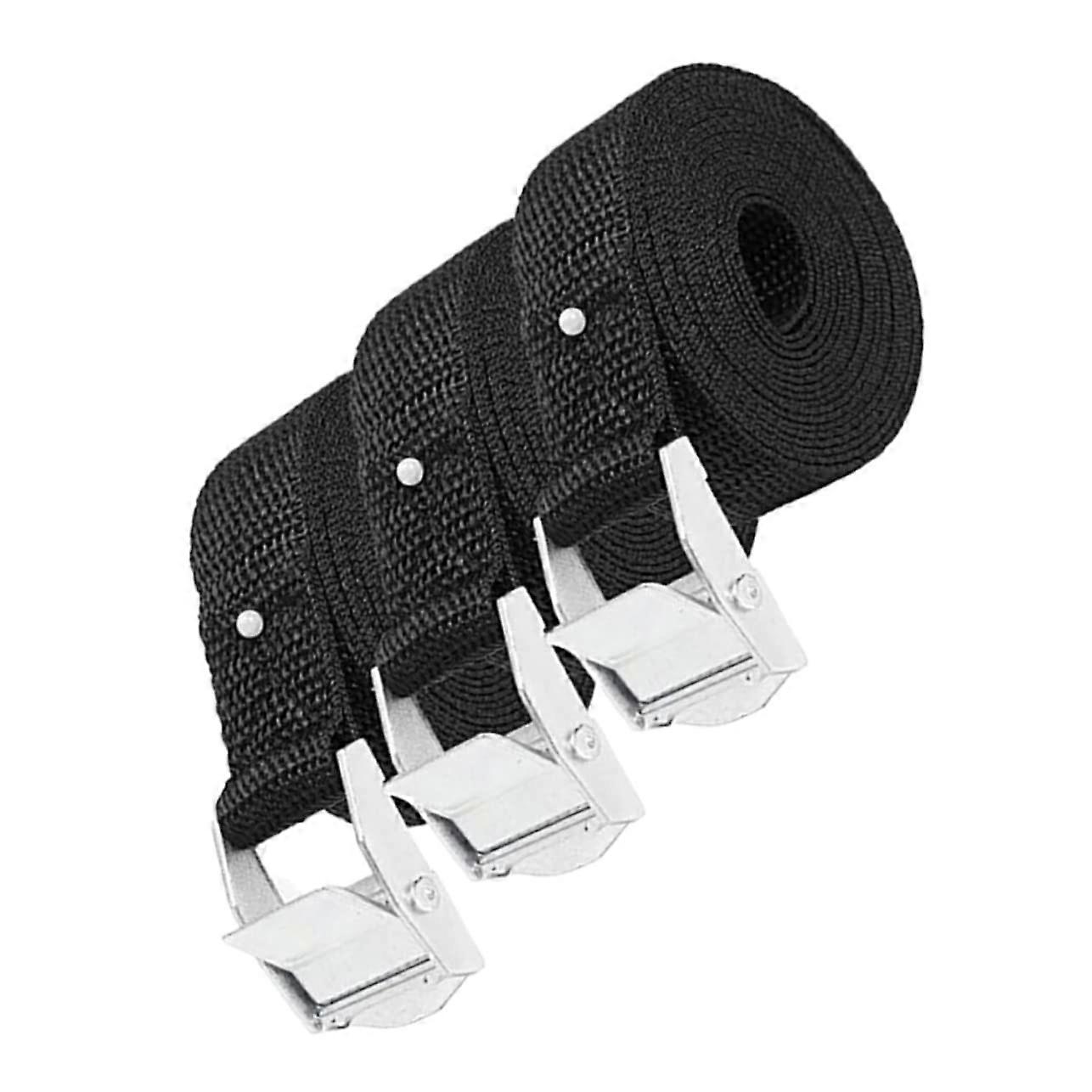 Product overview Package includes 3 long cam buckle tie down straps. Size: 2.5 cm width x 400 cm length per strap. Material: durable woven fabric webbing with metal alloy cam buckle. Color: not specified. Key benefits Secure fastening: metal cam buckle with press closure holds straps in place for steady cargo restraint. Durable construction: thickened woven webbing and alloy buckle resist wear and deformation for repeated use. Easy to use: simple feedandlock cam buckle design allows quick tensioning and release without complex tools. Versatile: long length and slim profile make these straps suitable for a variety of items and storage spaces. Features Heavyduty fabric webbing provides strength and abrasion resistance. Alloy cam buckle with press mechanism for reliable grip and easy adjustment. Long 400 cm length accommodates large items or multiple wraps. Compact 2.5 cm width fits through luggage handles and pack loops for convenient securing. Typical applications Travel: wrap around suitcases or luggage to keep zippers closed and bundles compact during transit. Moving and storage: secure furniture, boxes, or grouped items for transport in a vehicle or moving van. Outdoor and vehicle use: strap batteries or equipment in an RV battery box, or tie down cargo in a truck bed. Usage notes Thread the strap through the cam buckle, pull to tension, then press the buckle to lock. Inspect straps and buckles before each use and if fraying or buckle damage is visible. Not presented with specific load ratings; use appropriate caution and common sense when securing heavy loads. What you get Three long cam buckle straps, each 2.5 cm by 400 cm, ready for luggage, moving, and general cargo securing tasks.