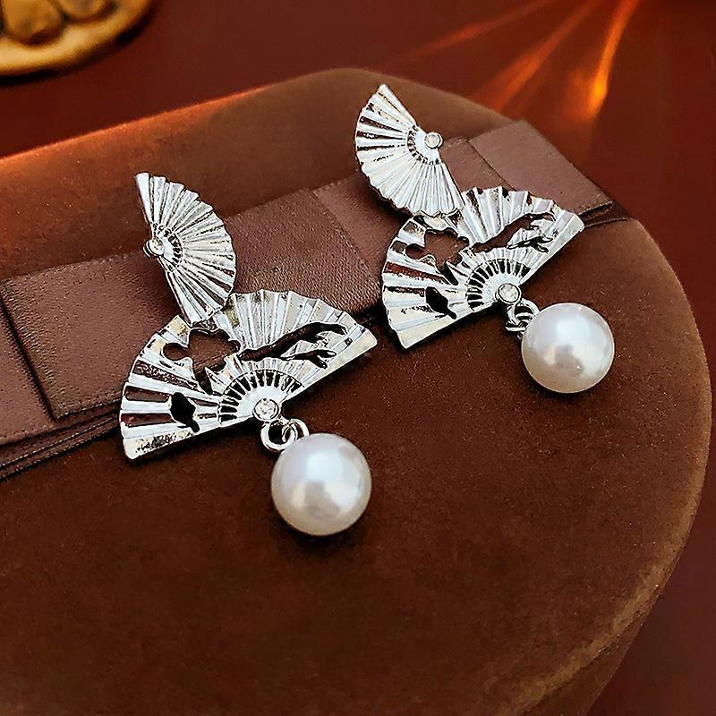 New Chinese Style Retro Long Jade Droplet Pendant Earrings For Women Fan Shape Long Tassel Charm Metal Earrings Jewelry Gifts