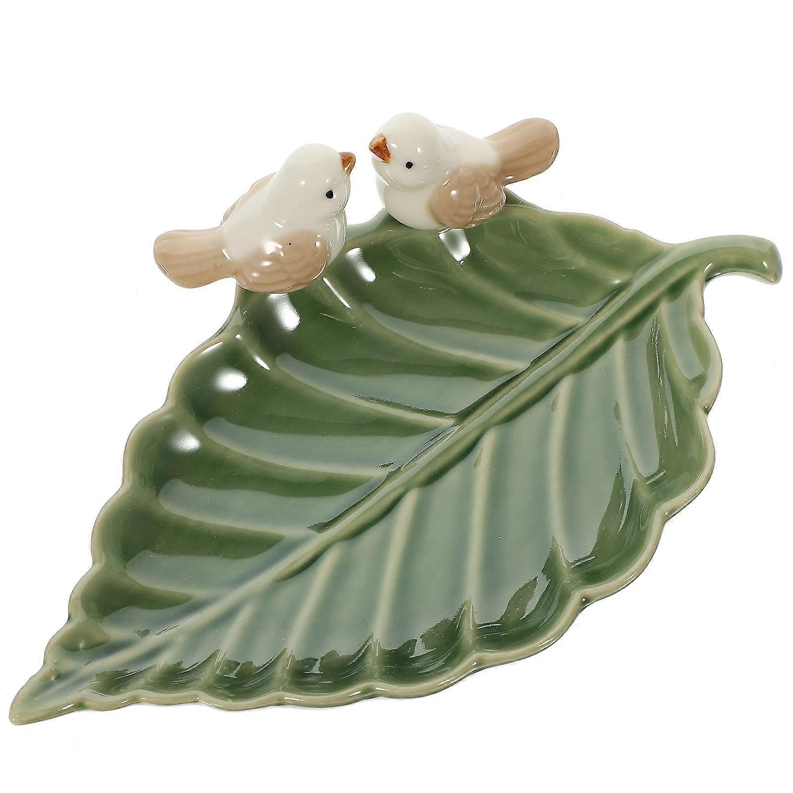 Ceramic Bird on Leaf Ring Dish Trinket Tray Green for Jewelry Storage