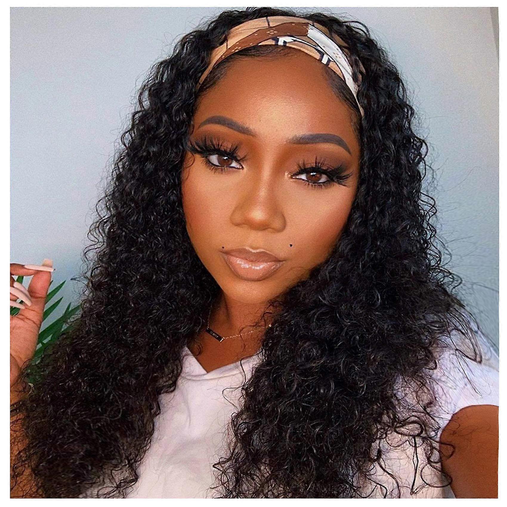 Glueless Kinky Curly Headband Wig Human Hair with Ice Silk Band for Black Women 20 Inch