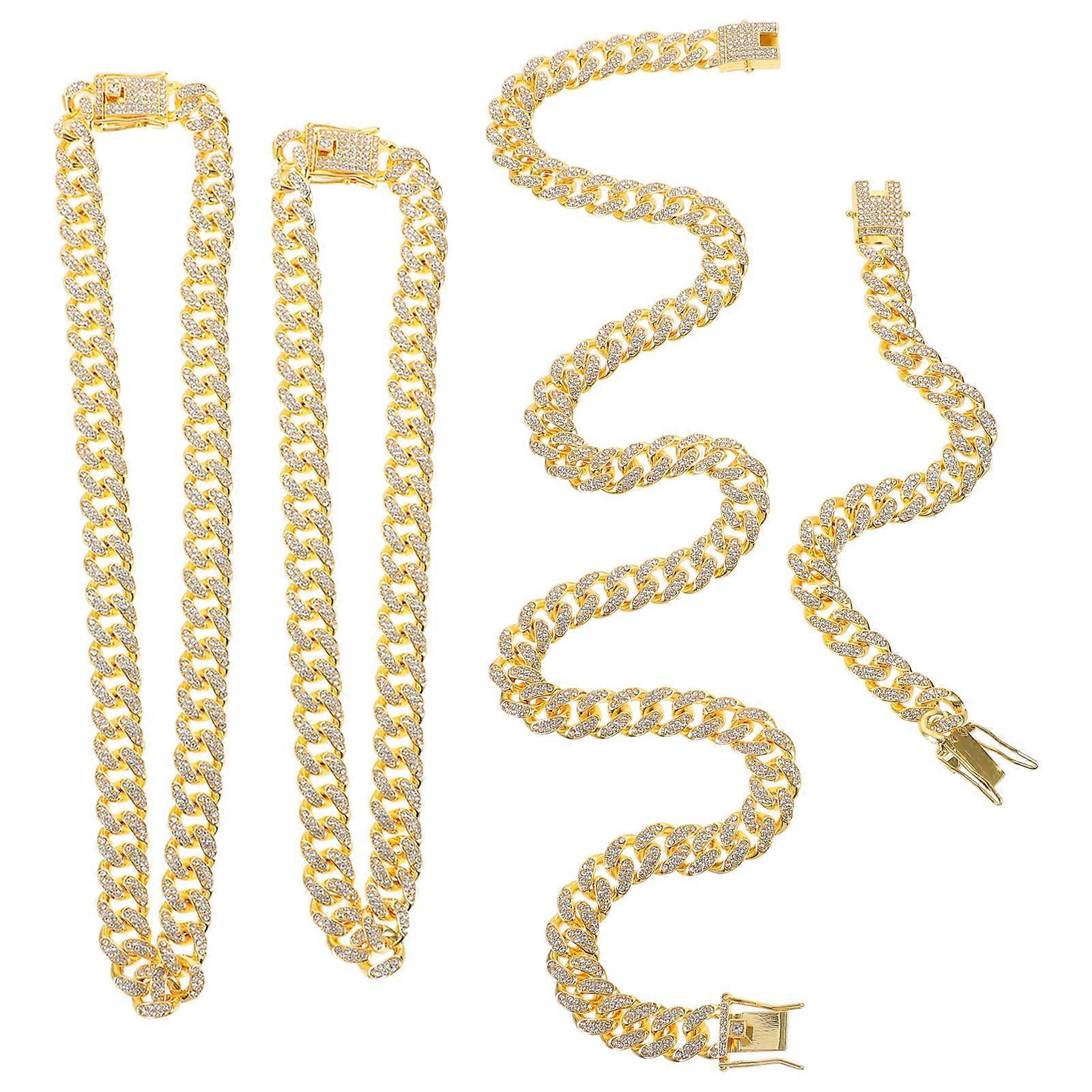 This set of link chain is perfect for both men and women. With different lengths to choose from, you can mix and match to create your own unique style. The classic design is both timeless and fashionable, while the rhinestone add a touch of luxury and sophistication. Features -Color:Golden -Material:Rhinestone, zinc alloy -Size:20.00X1.20X0.80cm/7.86X0.47X0.31in -Size:45.00X1.20X0.80cm/17.68X0.47X0.31in -Size:50.00X1.20X0.80cm/19.65X0.47X0.31in -Size:60.00X1.20X0.80cm/23.58X0.47X0.31in -This set includes different lengths of chain, allowing you to choose the perfect for your style and preference. -The rhinestone-studded design adds a touch of luxury and elegance to this hip-hop inspired necklace and bracelet set. -The classic design is timeless and versatile, making it suitable for both men and women to wear. -This set offers unbeatable value for those looking to add some bling to their jewelry collection. -Whether you're dressing up for a special occasion or adding some flair to your everyday look, this link set is sure to make a statement. Package list: 4 x link chains