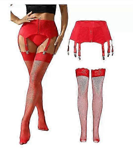 Red Lace Garter Belt Suspender Set for Women, Includes Metal Clips & Fishnet Stockings - Great for Burlesque, Stage Performance & Clubwear