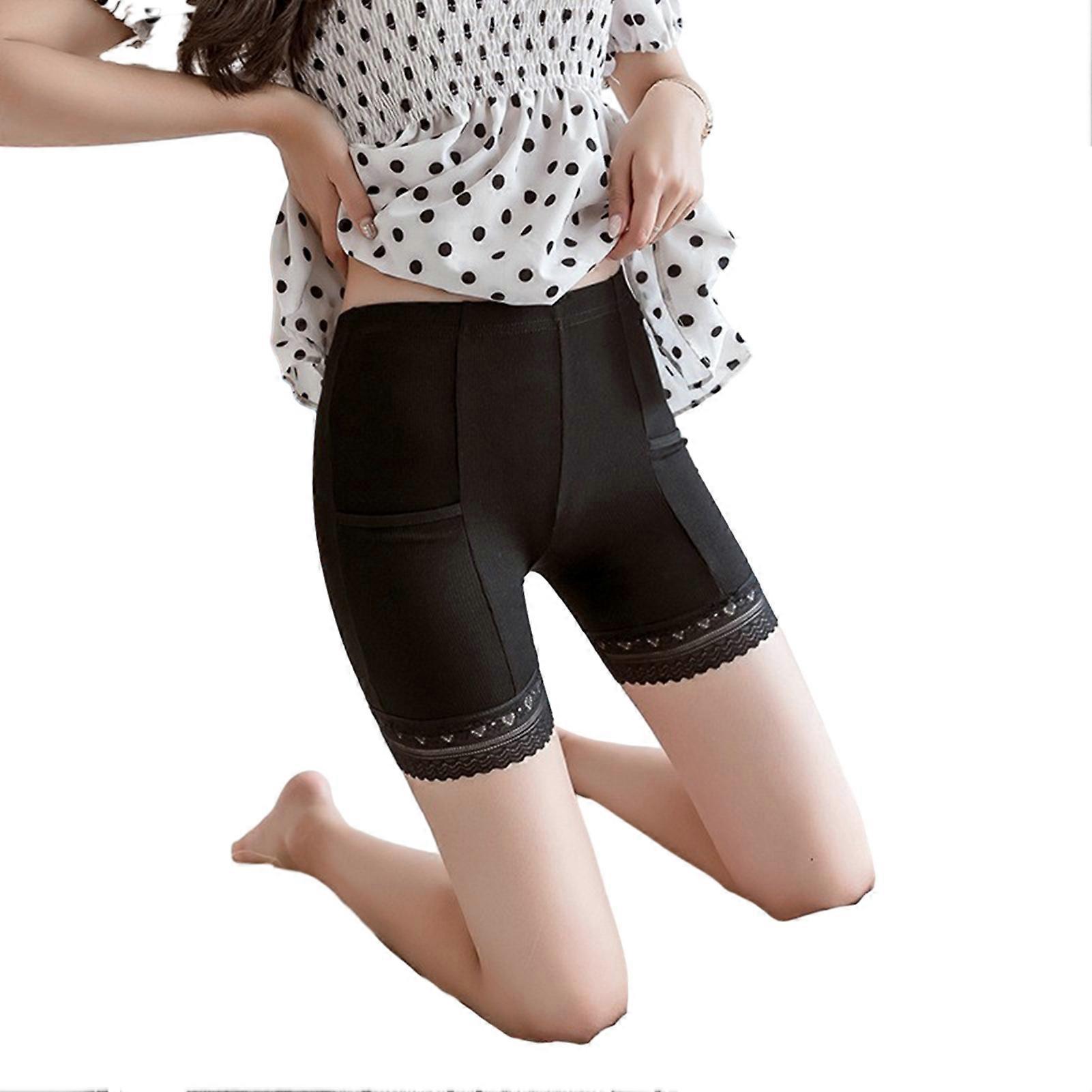 High-Waist Elastic Waistband Safety Shorts Lace Stitching Pockets Skinny Women Seamless Ribbed Slim