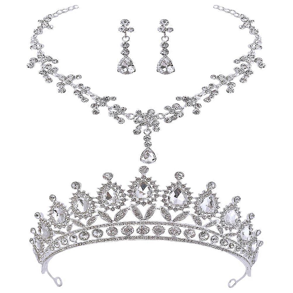Wedding Rhinestones Crown Necklace Earrings Set for Women in Silver