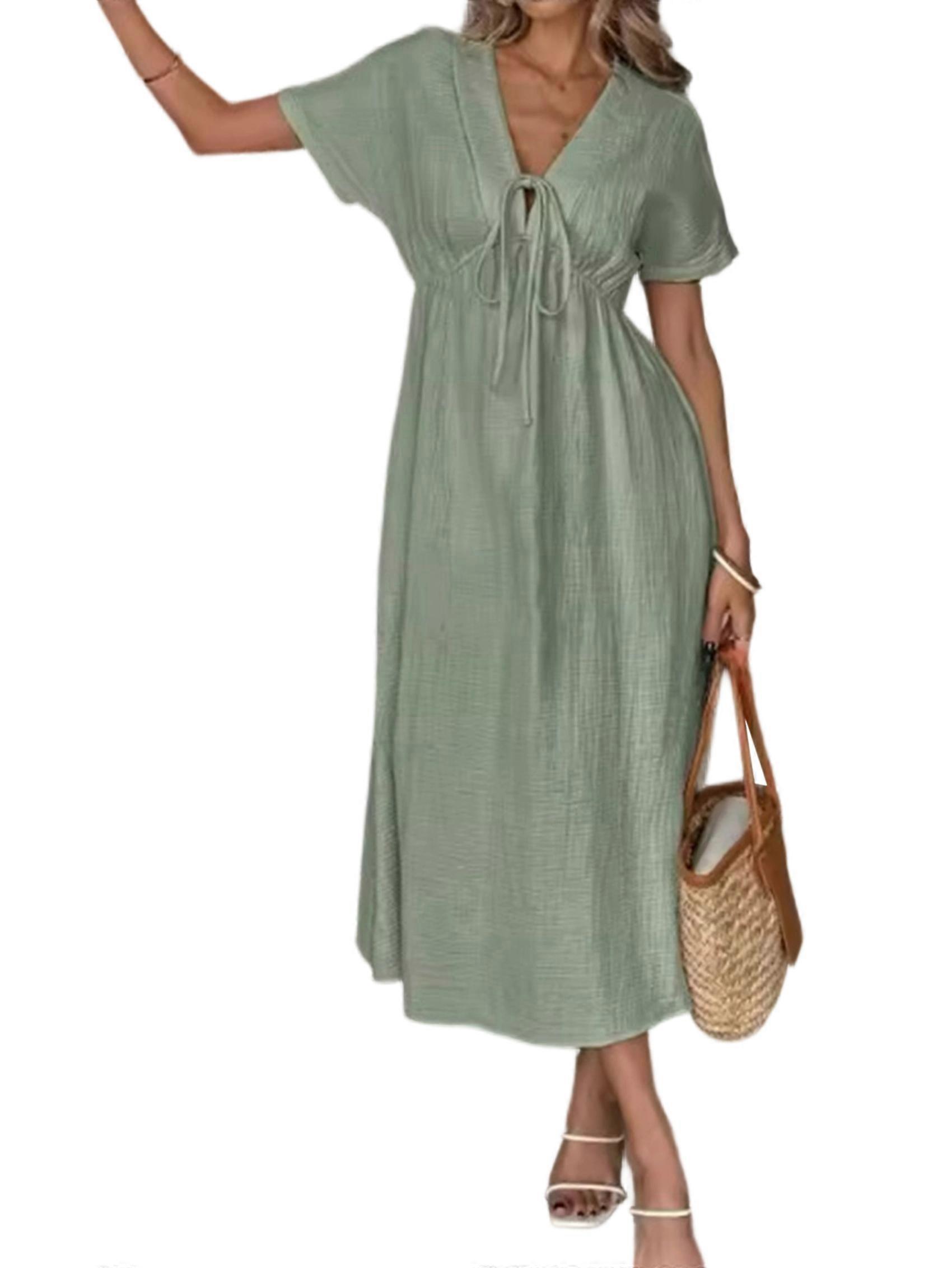 Dress for Women Casual Short Sleeve Tie V Neck Ruffle Midi Flowy Dresses Bean Green L