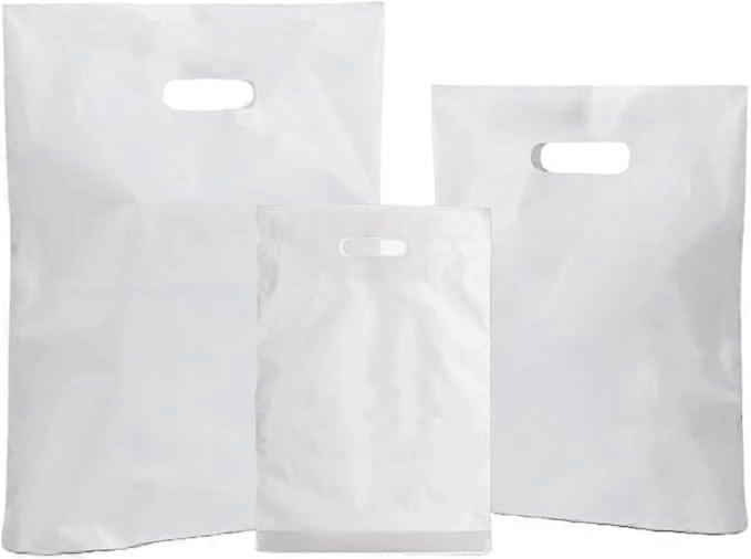 White Plastic Carrier Bags 10x12x4 with Reinforced Patch Handle, Heavy Duty Pack of 100 for Retail