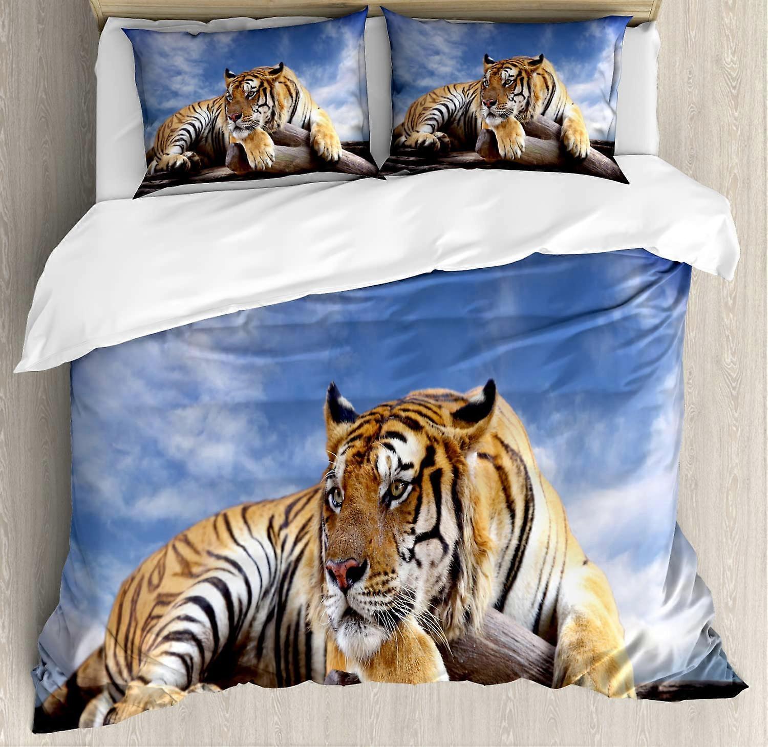 Tiger Duvet Cover Set King Size Wildlife Tiger Design 2 Pack with Pillowcases Mustard Black Blue