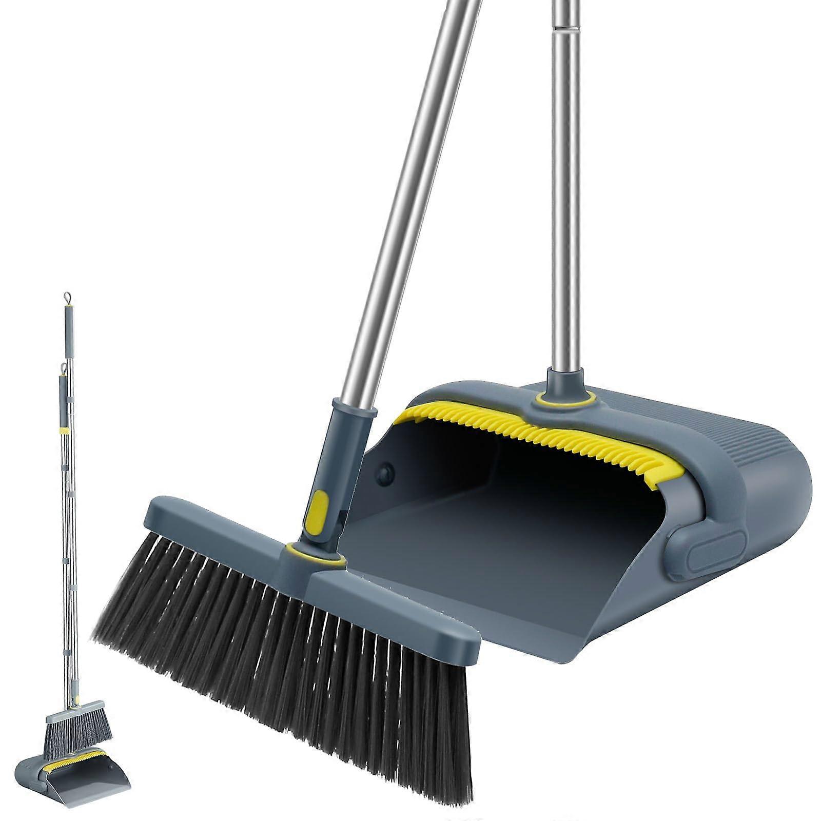 Broom and Dustpan Set with Long Handle, 180° Swivel Head, Teeth Comb Cleaning, Grey