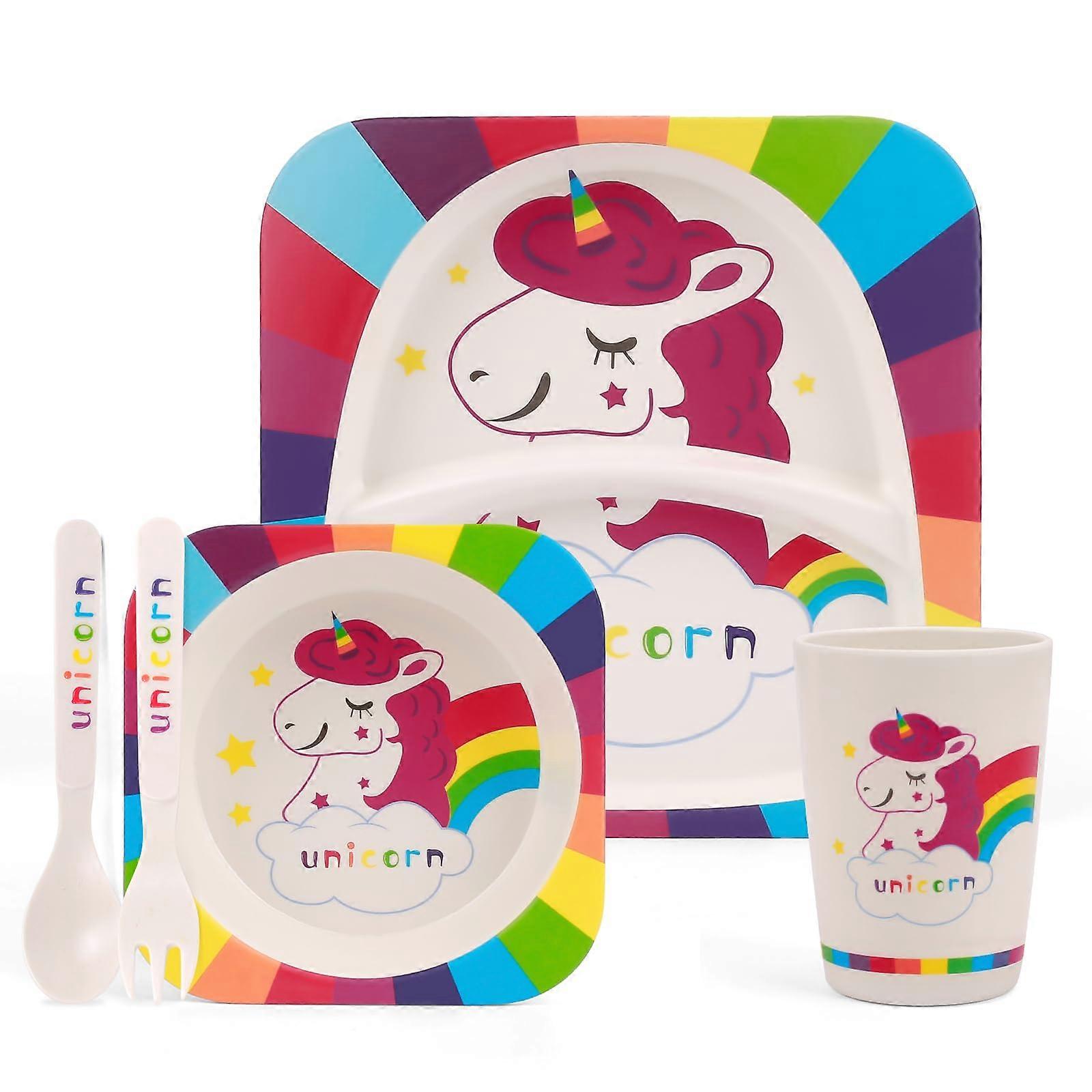 Kids Dinnerware Set Unicorn Design BPA Bamboo Fiber 5Piece Plate Bowl Cup Fork Spoon