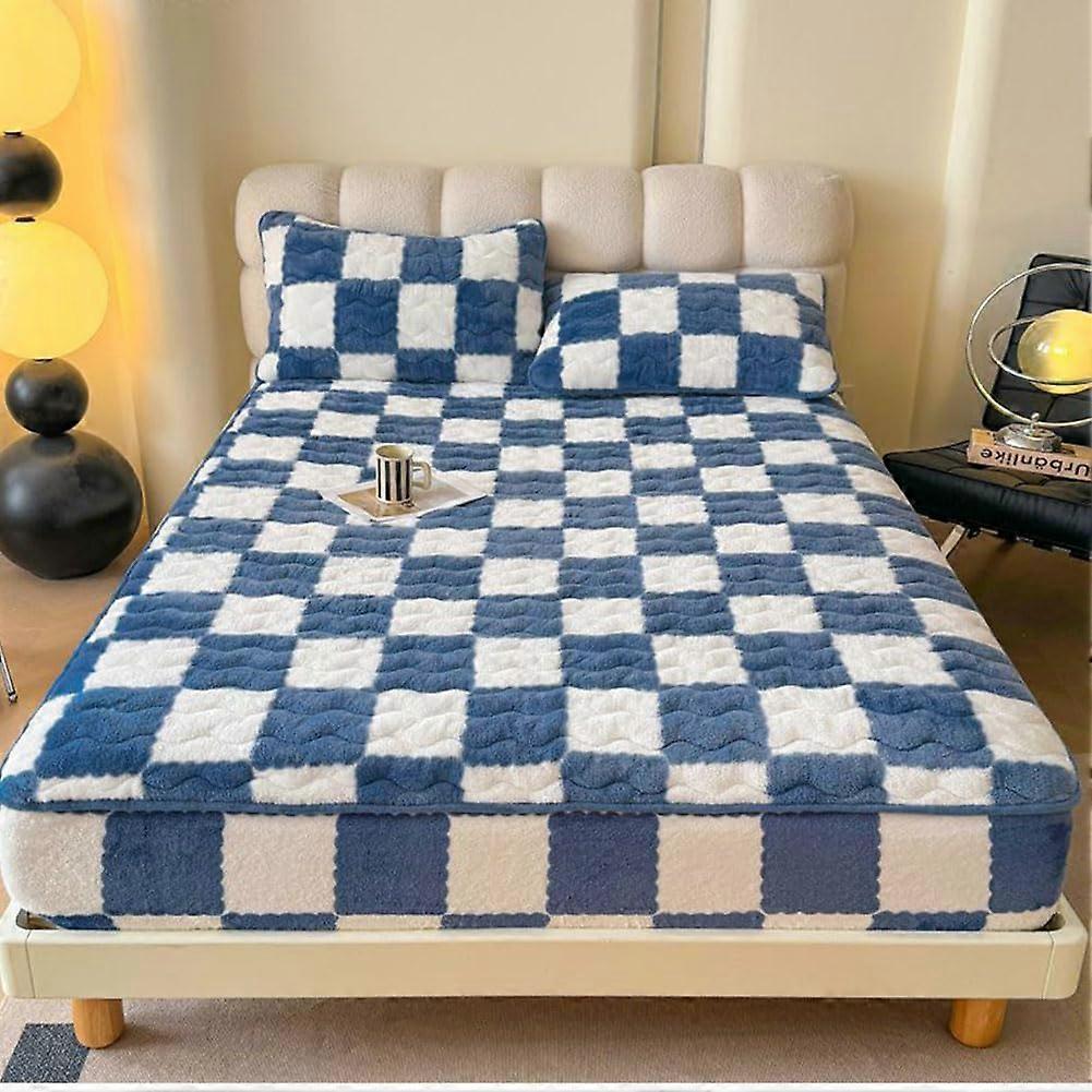 Luxury Mattress Cover Blue 70.8 x 78.7 in Milk Velvet Checkered Protector with Deep Pockets