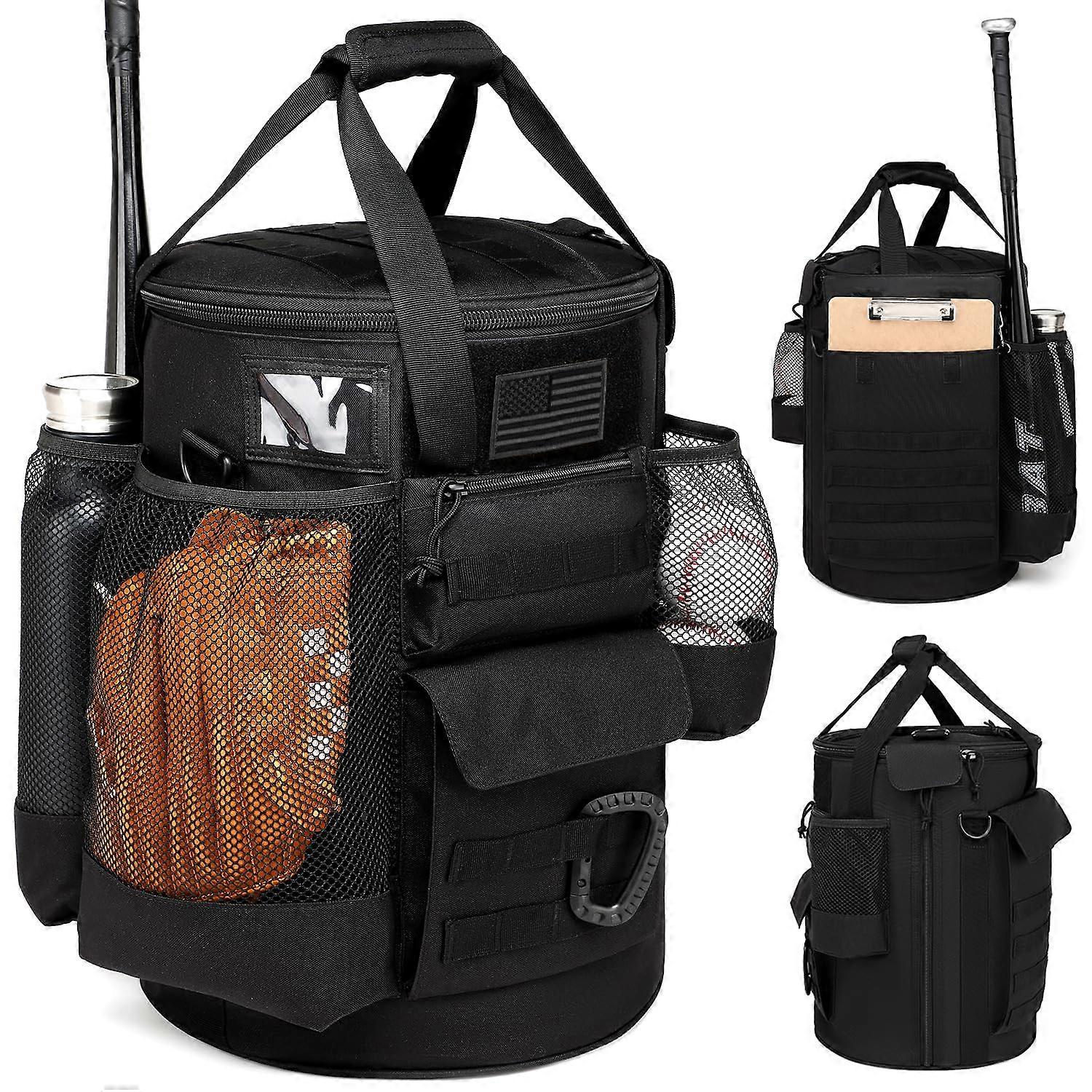 Baseball Bucket Bag with Multiple Pockets and Non‑Slip Bottom, Tactical Softball Organizer, Large Capacity Black