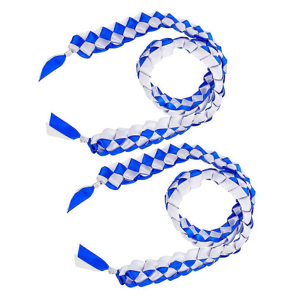 Graduation ribbon lei. This specially designed accessory is perfect for commemorating the graduation season and makes an ideal gift or souvenir. Its versatility isn't to necklaces, as it can also be worn as a bracelet, headband, and more. Features - Color: Blue -Material:Polyester - Size: 120.00X5.00X0.50cm/47.16X1.97X0.20in - craftsmanship: Each wreath is carefully crafted by hand for excellent quality and beauty. -Stylish two-tone design: Featuring a two-tone design, it symbolizes the joy and achievement of graduation. - The perfect graduation gift: Designed specifically for the graduation season, it is an ideal gift and souvenir. -Versatile: Wear as a necklace or transform into a bracelet, headpiece or other accessory for a variety of styling options. -Braided graduation honor necklace is made of polyester, smooth and glossy, easy to match with your graduation cap and gown. Package list: 2 x Graduation Honor Cords