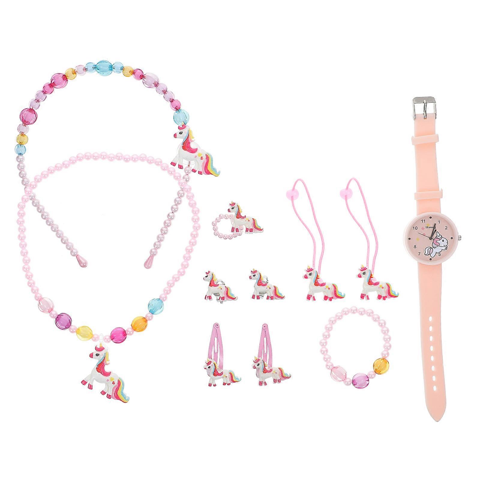 Unicorns Watch Girls Cartoon Watch Necklace Hair Accessories 1Set Pink