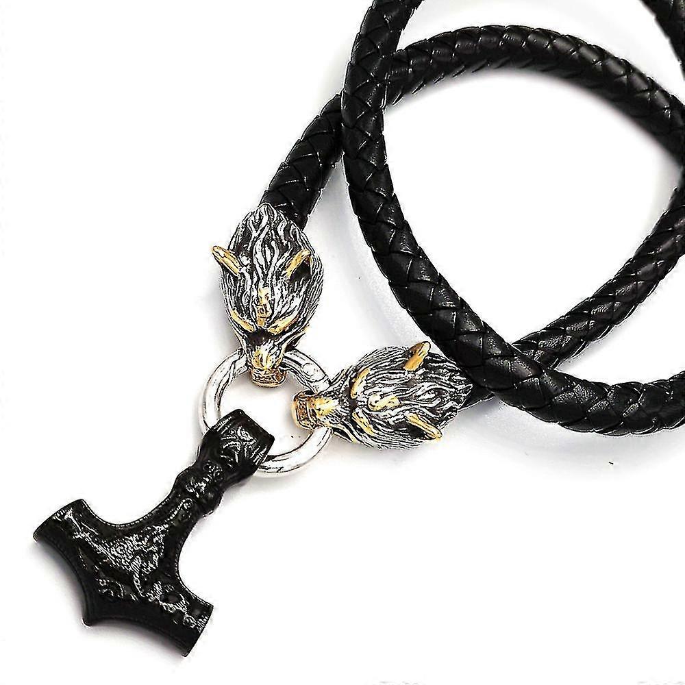 Stainless Steel Viking Wolf Head Doubles Color Thor S Hammer Pendant Leather Chain Men S Necklace Jewelry S07