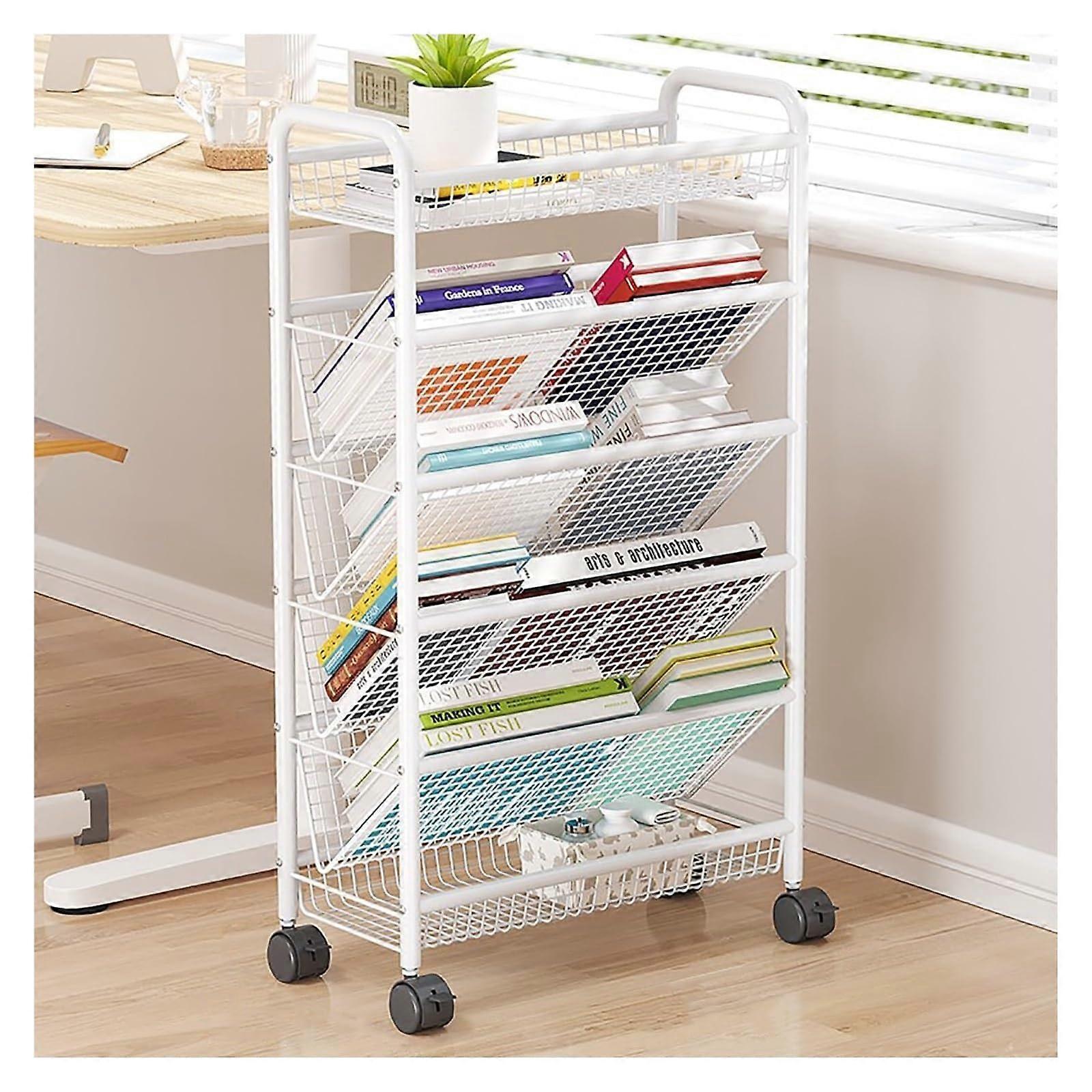 Rolling Book Cart 6 Tier Metal Mobile Bookshelf with Lockable Casters, White Slim Corner Storage Rack