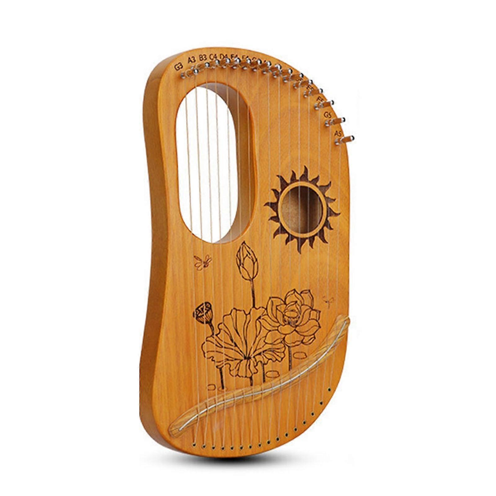 Product: Lyre Harp Color options: C, wood color, coffee color, blue Why choose this lyre harp Solid resonance body for stable tone: Built with a hardness, density solid wood resonance box that holds tuning well and prevents string ends from cutting into the wood. Durable string anchors: Each string hole is fitted with a metal sleeve that protects the wood, keeps strings securely in place, and improves long term stability. Clear, pleasant sound: The body and bone saddle transmit string vibration efficiently, producing warm, clear, and sustained tones suitable for solo playing and accompaniment. Comfortable and portable: Rounded edges and a smooth, carefully polished surface make the instrument comfortable to hold and easy to play. Compact size makes it simple to carry and use anywhere. Key features Materials and construction: Solid wood resonance box with attractive light wood grain and retro carving details. Bone saddle for improved vibration transfer. String anchor design: Metalsleeved holes protect the wood and prevent strings from slipping in, extending the instrument service life. Ergonomic build: Rounded edges and a loop end design add comfort and tuning stability. Exquisite workmanship with a super smooth finish. Tuning support: Comes with a tuning wrench and supports tuning apps for quick and accurate tuning. Tone characteristics: Warm voiced with clear harmonics. Tapping the strings produces a sustained ringing effect that many players find soothing. How to tune Initial tuning: Tune the lyre harp when you first receive it. Turn the tuning pins clockwise to tighten and raise pitch, counterclockwise to loosen and lower pitch. Pitch guidelines: Shorter strings and higher tension produce higher pitches. Use a tuning app for precise reference. Accessories included: Tuning wrench included and app support available for ease of tuning. Practical uses Home practice and small performances: Compact size and warm tone make this lyre harp ideal for practicing at home, playing at small gatherings, or accompanying vocalists. Travel and outdoor playing: Lightweight and portable design lets you bring the instrument on trips, picnics, or outdoor sessions. Teaching and group classes: Clear tones and easy tuning make it a practical choice for music instructors and classroom demonstrations. What you get A lyre harp with solid wood resonance body, metalsleeved string holes, bone saddle, loop end design, and rounded edges. A tuning wrench and support for tuning apps. Available in C color option plus wood color, coffee color, and blue styles. Notes Tune upon arrival for performance. Follow clockwise tighten and counterclockwise loosen instructions when adjusting tuning pins. Shorter strings and increased tension yield higher pitches. Use a tuning app for accurate reference. This lyre harp combines stable construction, protective metalsleeved string holes, ergonomic design, and clear tone in a portable package suitable for practice, performance, and travel.