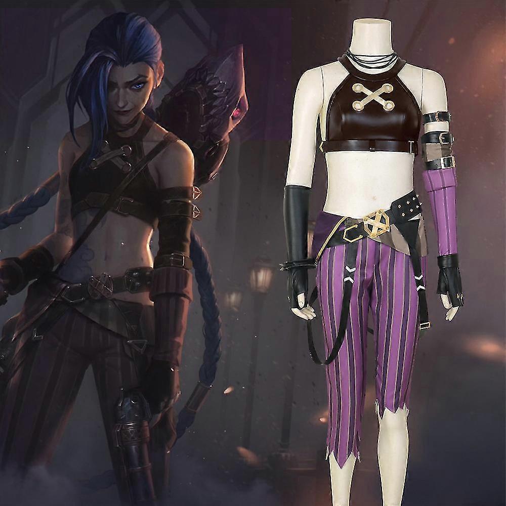 Gender: Unisex Item Type: Sets Characters: jinx Source Type: GAME Material: Polyester Special Use: Costumes Characters: Arcane Jinx Cosplay The full set includes: Top + Pants + Necklace + Belt + Sleeve + Armband + Gloves + Wig