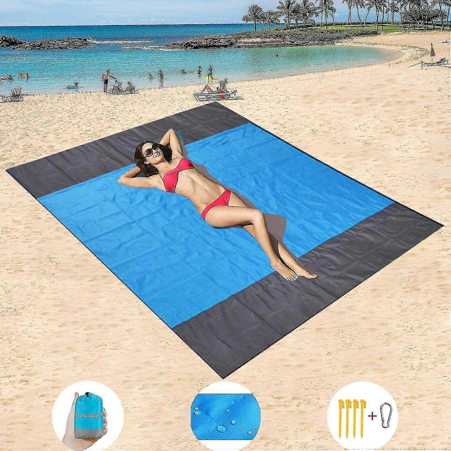 Beach Mat, Extra Large 200cm X 210cm Waterproof Anti-sand Picnic Blanket, Machine Washable Nylon With 4 Stakes (blue 2) S05