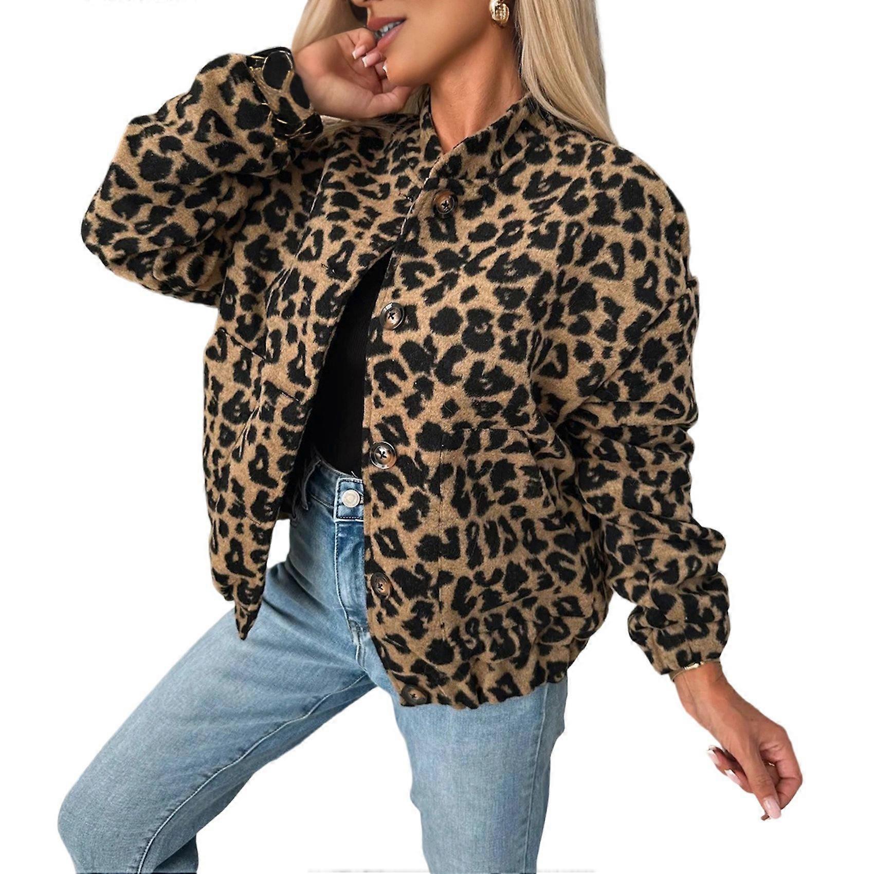 Women'S Leopard Print Wool Coat Button Down Stand Collar Jacket with Pockets Leopard Print XL