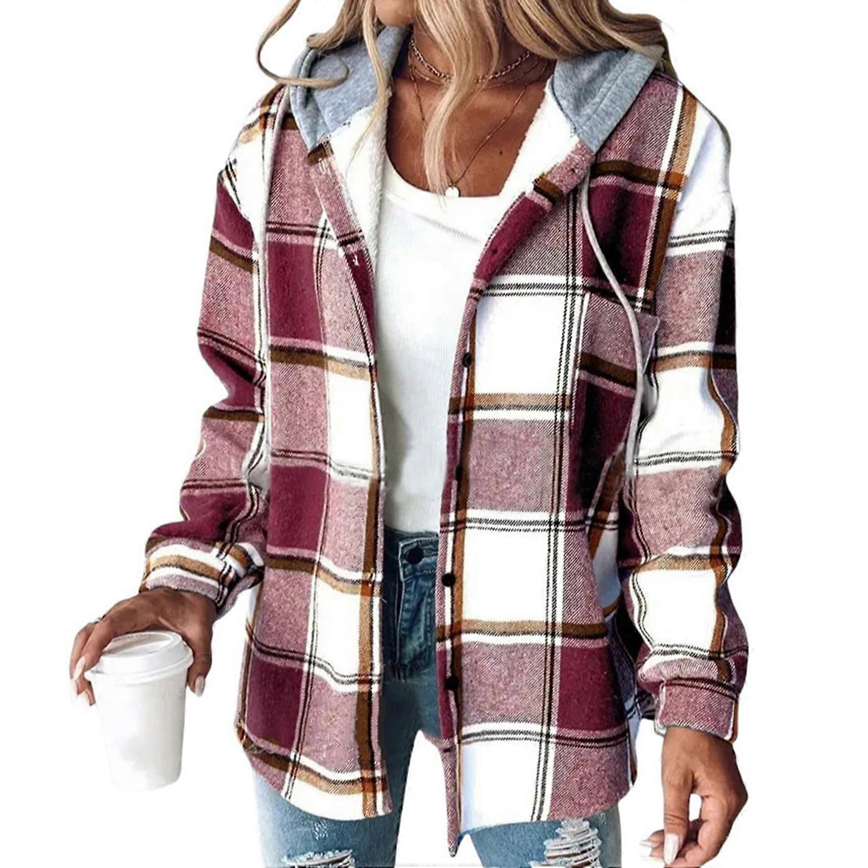 Women'S Plaid Shirts Button Down Long Sleeve Jacket Fleece Lined Hoodie Casual Trendy Blouse Top Brick Red L