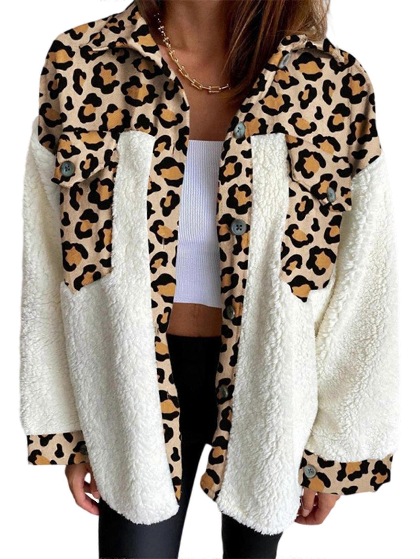 Women'S Flannel Button Down Fleece Jacket Fall Fuzzy Lapel Long Sleeves Plaid Blouse Jacket Leopard Print M