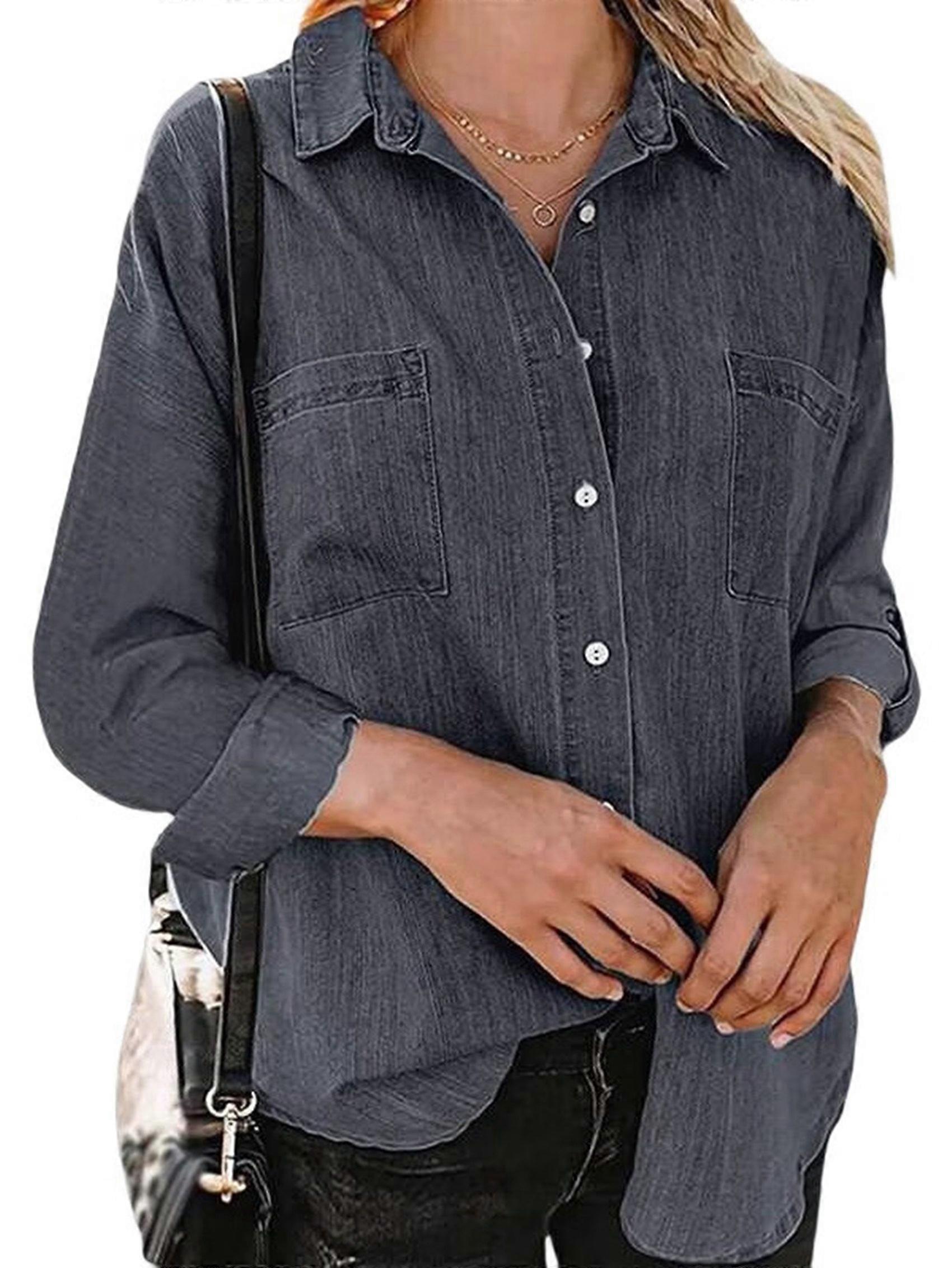 Womens Button Down Shirts V Neck Loose Casual Shirt Black XXL