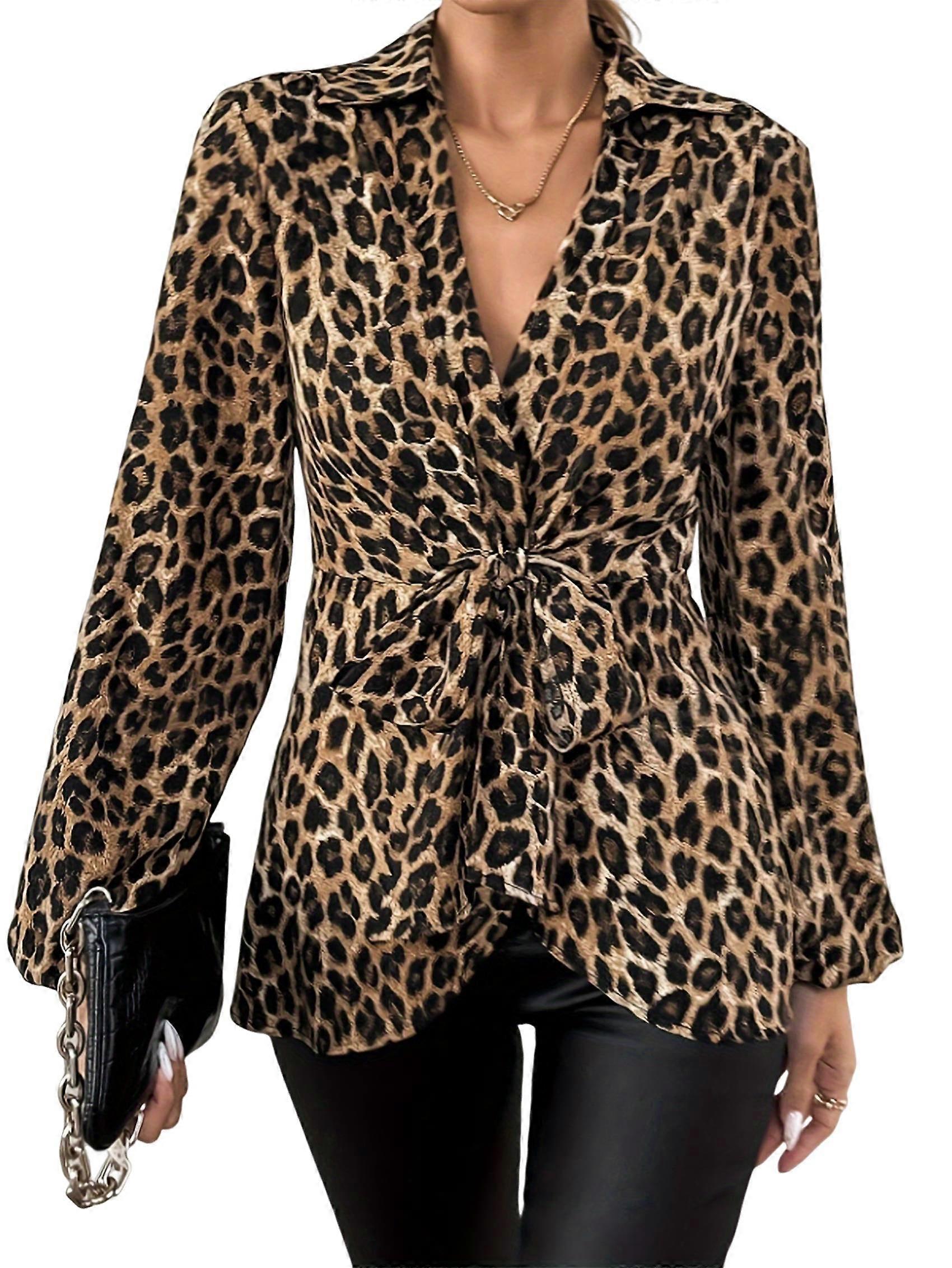 Women'S Leopard Print Blouse Long Sleeve V Neck Tie Front Lapel Collar Top Trendy Blouse Shirt Leopard Print M