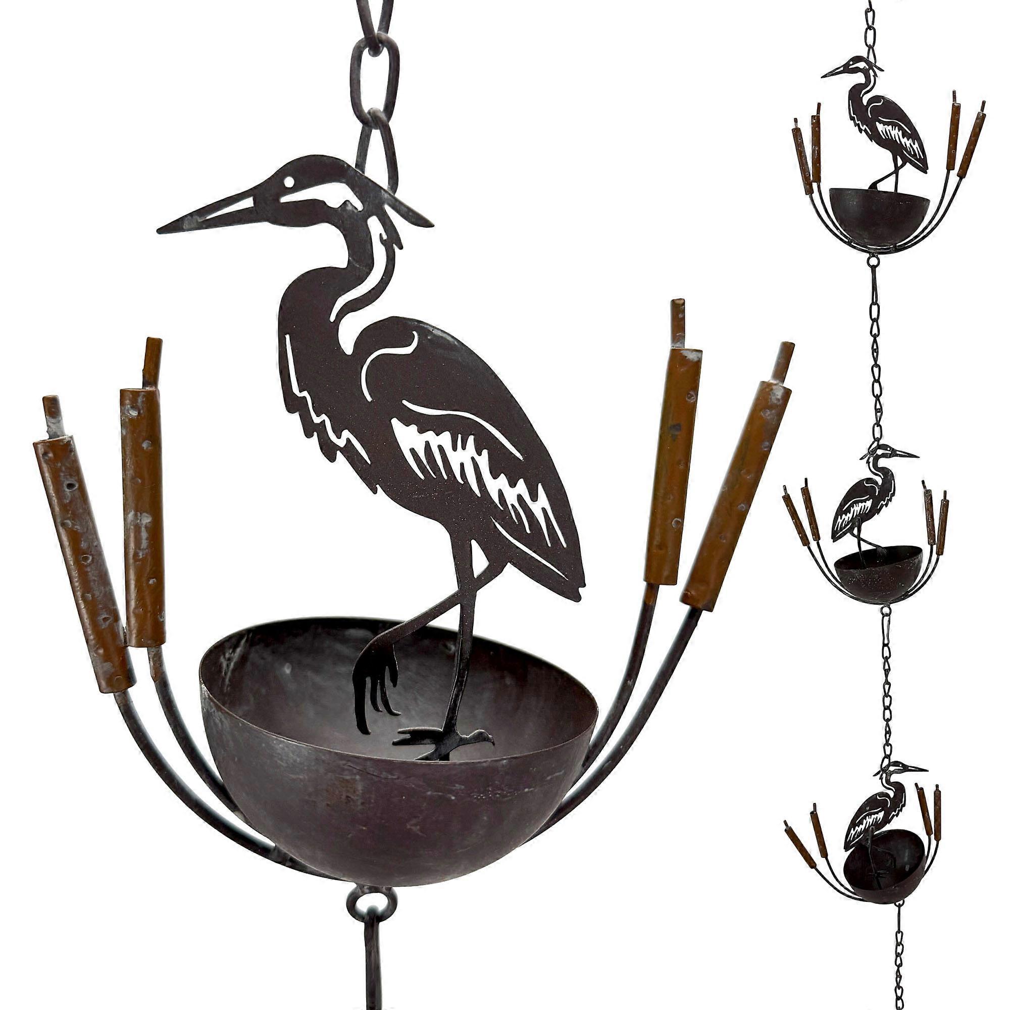 Metal Rain Chain, 102 in Extra Long Distressed Rustic Heron Bird Cup Design, Wall-Mounted Hanging Gutter Downspout Alternative for Outdoor Porch, Patio, Garden, Yard, Beach House Decor Accent