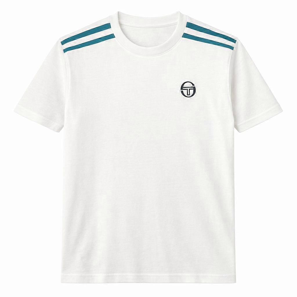 Indulge in the luxurious style of Sergio Tacchini with the Locchi T-Shirt in Gardenia/Harbor Blue. Its regular fit, crew neck, and sleeve cuffs exude sophistication, while the short sleeve and double stripe detail add a touch of exclusivity. Regular fit Crew neck Double stripe detail to the shoulders Short sleeves Embroidered chest logo 100% Cotton Sergio Tacchini branding