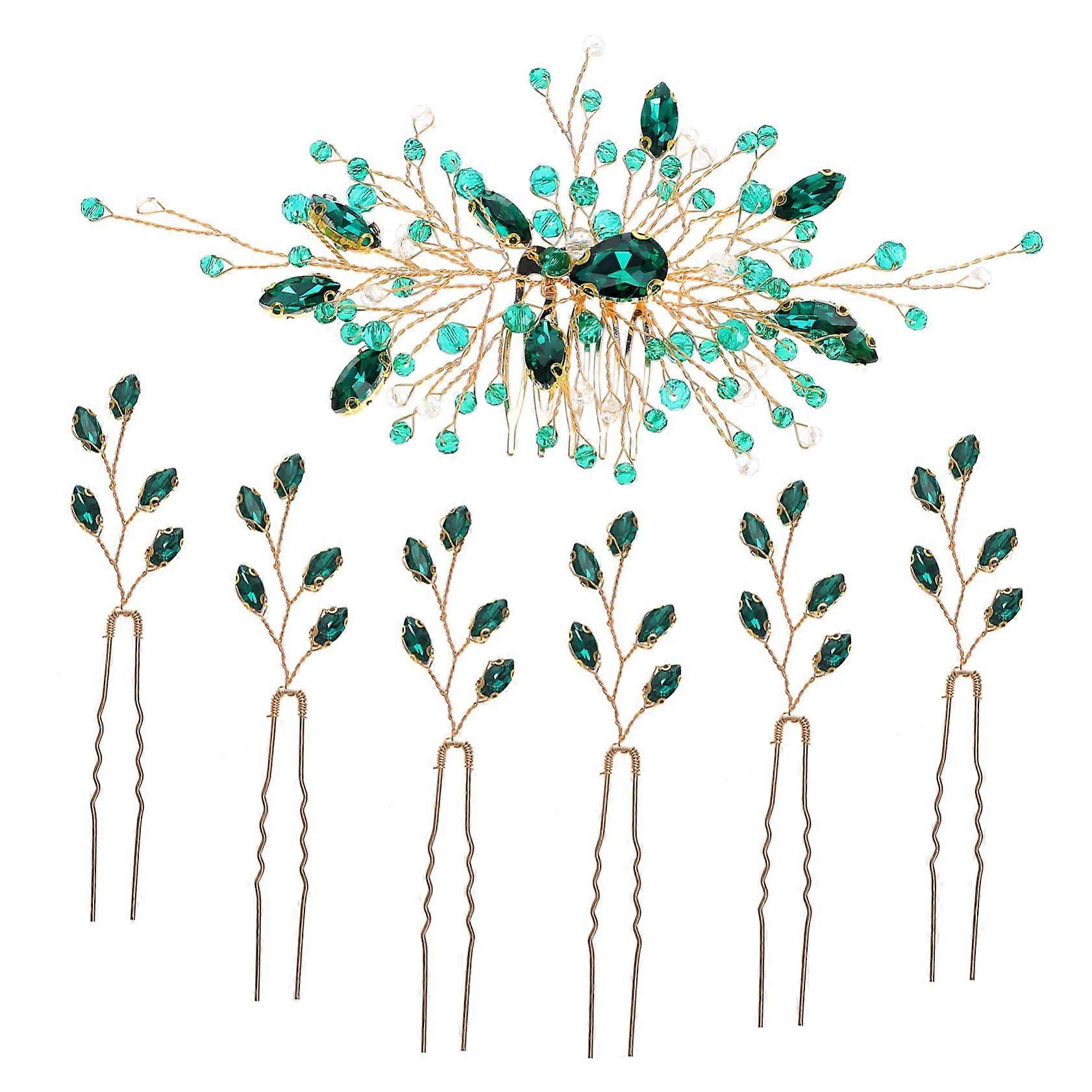 Bridal Hair Comb with Green Rhinestones Elegant Leaf Design Wedding Side Hair Accessory Set