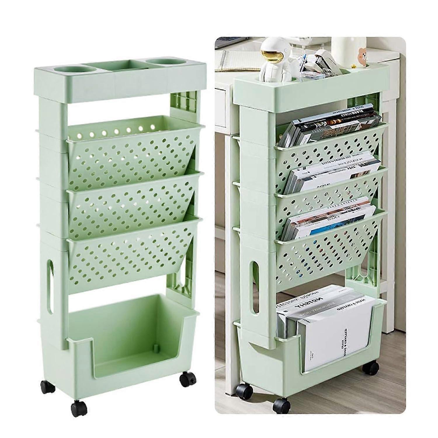 5 Tier Rolling Bookshelf Cart with Magazine Rack and Wheels, Green Utility Storage Trolley Organizer
