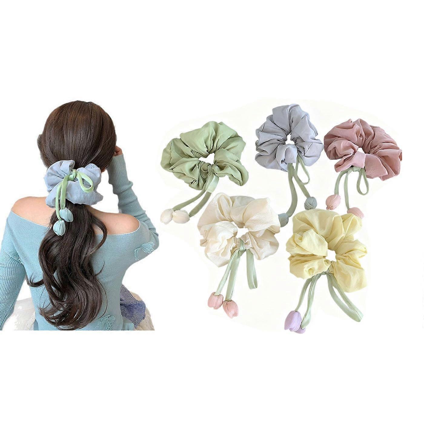 5 Pcs Pastel Floral Hair Scrunchies with Tulip Detail, Soft Hair Ties Set for Women Spring