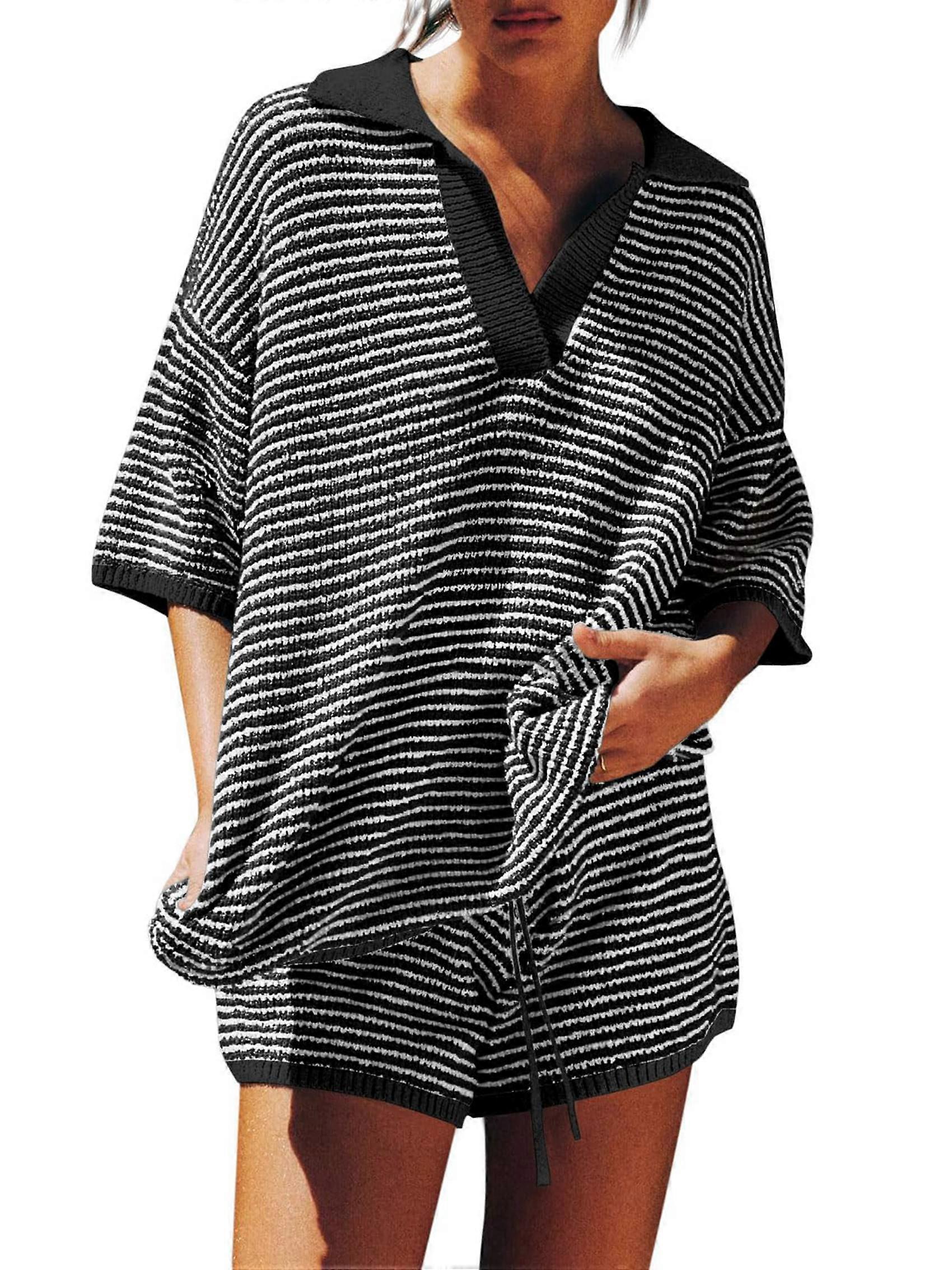 Womens Sweater Set 2 Piece Outfits Oversized 3/4 Sleeve V Neck Knit Tops High Waisted Shorts Lounge Sets Black Stripes L