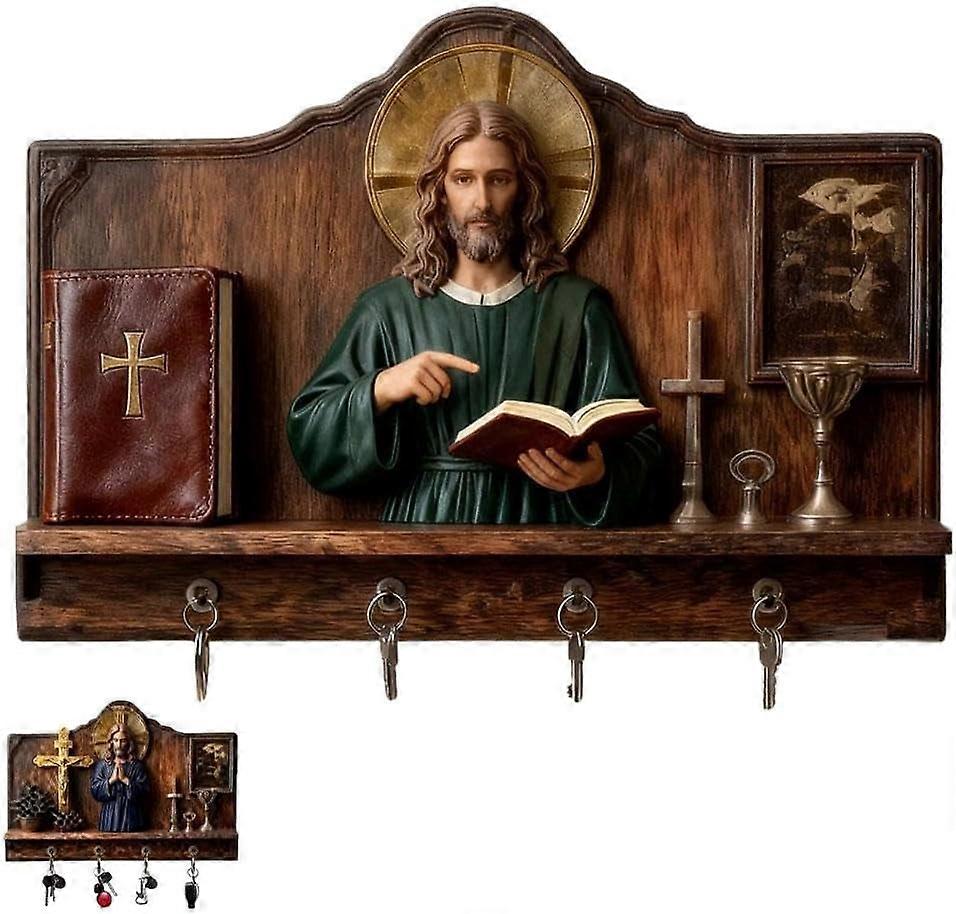 Wooden 2D Jesus Communion Key Ring Holder with 4 Hooks, Christian Wall Art – Compatible with Home & Entryway Decor