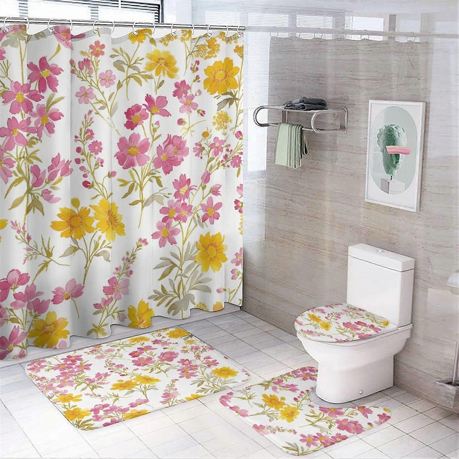 4-Pc Shower Curtain Set with Waterproof Curtain, Non-Slip Rug, Toilet Lid Cover & Bath Mat – Pink/Yellow Watercolor Floral