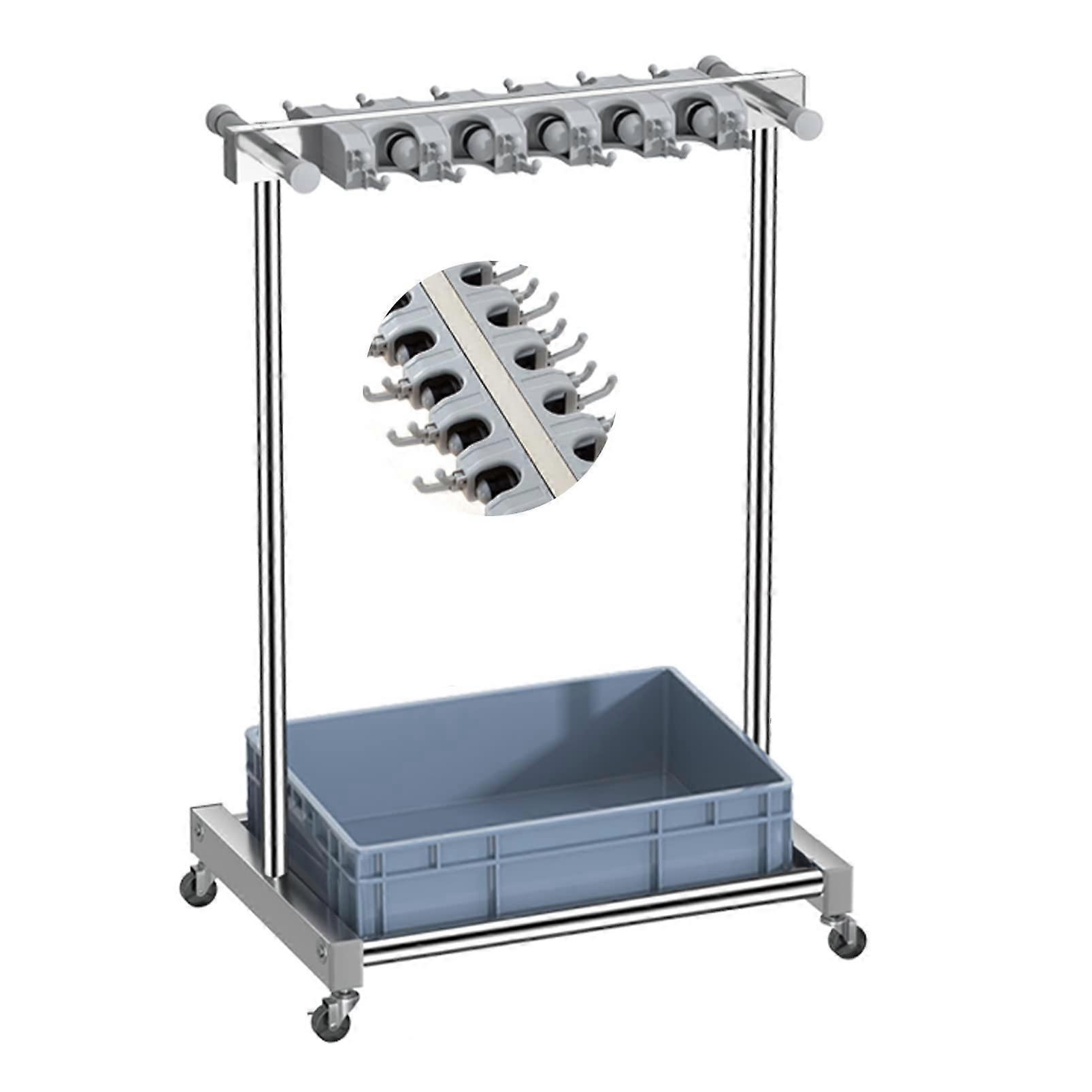 HeavyDuty Stainless Steel Mop and Broom Holder with Wheels, Double Row Rack with Drain Basin
