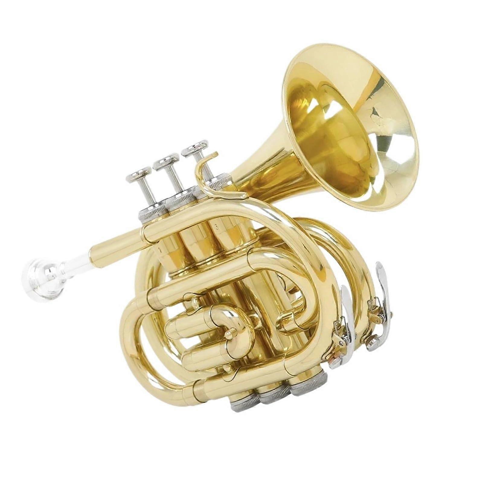 Pocket trumpet in B flat designed for durability, consistent performance, and easy portability. Built from solid brass with a polished finish, this instrument delivers a warm, bright tone and responsive playability well suited to beginners and adult players alike. Key benefits Durable construction that grows with your skills: solid brass body and quality workmanship provide longterm reliability across a variety of musical styles. Clear, projecting sound: broad warm core with bright overtones and strong penetration for clear presence in ensembles or solo practice. Playerfriendly response: responsive vibration and low resistance support easier tone production and faster improvement for learners and experienced players. Portable and complete: compact dimensions and included carrying bag make it easy to transport and store. Features Material: Brass for consistent resonance and durability Pitch: B flat standard tuning Size: 23*15*11.5 cm; compact pocketsized form Weight: 1000 g for a stable playing feel without excess bulk Finish: Exquisite painting process for a clean, uniform color and good reflectivity Tone quality: Bright and clear with full vibration and strong projection Valve system: Sturdy valves with quick springs, reliable airtightness, and low resistance when adjusting the tuning slide Water key: Secure fit with good airtightness What is included 1 Pocket Trumpet 1 Mouthpiece 1 Cleaning cloth 1 Pair of gloves 1 Portable bag Practical use scenarios Travel and practice on the go: Compact size and included bag make this trumpet ideal for musicians who need a reliable instrument while traveling or commuting. Lessons and classroom use: Responsive valves and clear tone support skill development for beginners and adult learners during practice and lessons. Small ensembles and casual performance: Bright projection and consistent intonation make it suitable for chamber groups, rehearsals, and lowkey performances. Additional packaging information Packaging size: 31*25*16 cm Packaging weight: 1850 g This pocket trumpet offers a balanced combination of durable materials, dependable mechanics, and clear sound, making it a practical choice for players seeking portability and consistent performance.