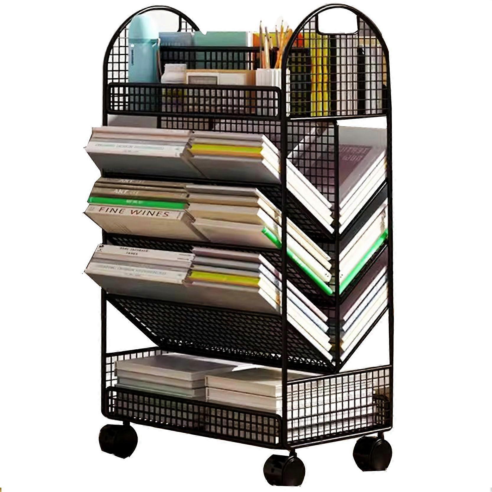 5 Tier Rolling File Cart with Wheels, Metal Bookshelf Cart for Office, Classroom, Black Storage